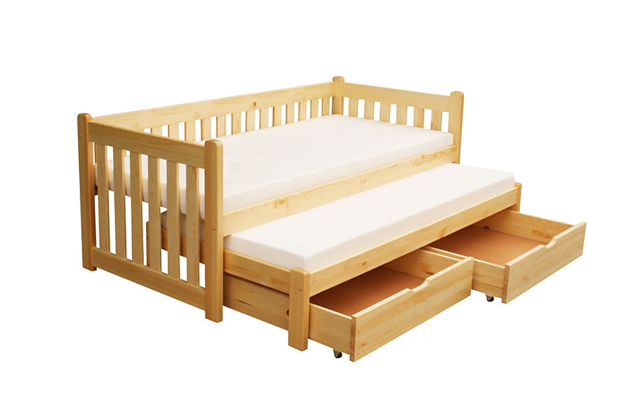 Łóżko MAKARY II zostało wykonane z litego drewna sosnowego, które cechuje się naturalnymi właściwościami konstrukcyjnymi oraz ekologicznymi. Wysuwana druga część sypialniana pozwala zaoszczędzić miejsce w pokoju, a dwie szuflady pomieszczą dodatkową parę pościeli, kołder, prześcieradeł i poduszek. Gwarancję wieloletniego użytkowania zapewnia solidna i trwała konstrukcja.