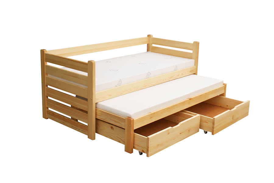 Łóżko TYCJAN II zostało wykonane z litego drewna sosnowego, które cechuje się naturalnymi właściwościami konstrukcyjnymi oraz ekologicznymi. Wysuwana druga część sypialniana pozwala zaoszczędzić miejsce w pokoju, a dwie szuflady pomieszczą dodatkową parę pościeli, kołder, prześcieradeł i poduszek. Gwarancję wieloletniego użytkowania zapewnia solidna i trwała konstrukcja.