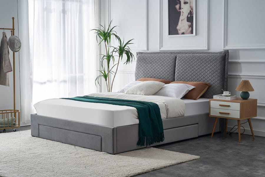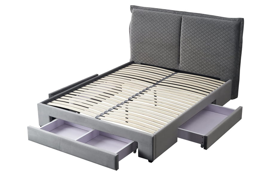 Łóżko z pojemnikiem na pościel, materiał: tkanina - velvet / drewno lite, kolor: jasny popiel, * łóżko bez materaca, w opcji materac POLARIS 160 lub SYRIUSZ 160