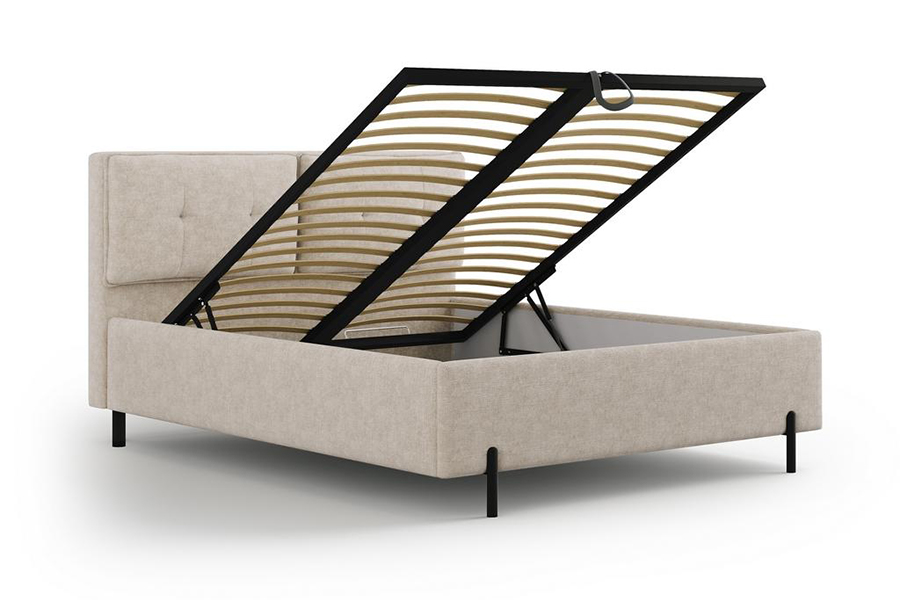 Belliso to łóżko sypialniane, tapicerowane z pojemnikiem na pościel i regulowanymi zagłówkami, które można dopasować pod względem wyglądu i tkaniny. Szerokość 149 cm, głębokość 221 cm, wysokość 111 cm i powierzchnia spania 140x200 cm sprawiają, że łóżko sprawdzi się w standardowej sypialni małżeńskiej. Wezgłowie zostało wyposażone w ruchome poduszki, których rodzaj przeszyć i formę można wybrać indywidualnie w konfiguratorze. Oparcia są regulowane, co zwiększa wygodę podczas siedzenia, czytania lub pracy w łóżku. Mebel posiada metalowy stelaż z podnośnikiem gazowym, który unosi się i odkrywa duży pojemnik na pościel znajdujący się pod całą powierzchnią materaca. Konstrukcja ramy wykonana została z tapicerowanej płyty, a całość wsparta jest na wysokich nogach, co ułatwia sprzątanie pod łóżkiem i nadaje mu lekką formę. Tkaninę obiciową można wybrać z dostępnych propozycji w konfiguratorze. Materac nie jest dołączony do zestawu, co pozwala na dobór odpowiedniego modelu we własnym zakresie. Łóżko z pojemnikiem na pościel i regulowanymi zagłówkami Belliso to dobry wybór do nowoczesnych wnętrz, gdzie liczy się prostota formy i dopasowanie do indywidualnych potrzeb. Tapicerowane wezgłowie i możliwość konfiguracji wizualnej sprawiają, że łóżko dobrze odnajduje się w różnych aranżacjach.