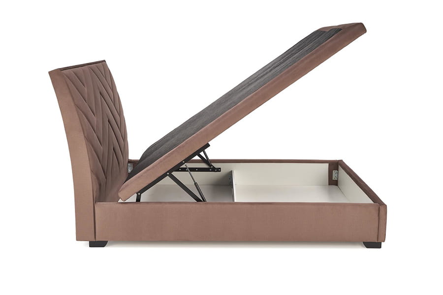 Łóżko z pojemnikiem na pościel, materiał: tkanina - velvet / drewno lite, kolor: beżowy, łóżko bez materaca, w opcji materac POLARIS 160 lub SYRIUSZ 160
