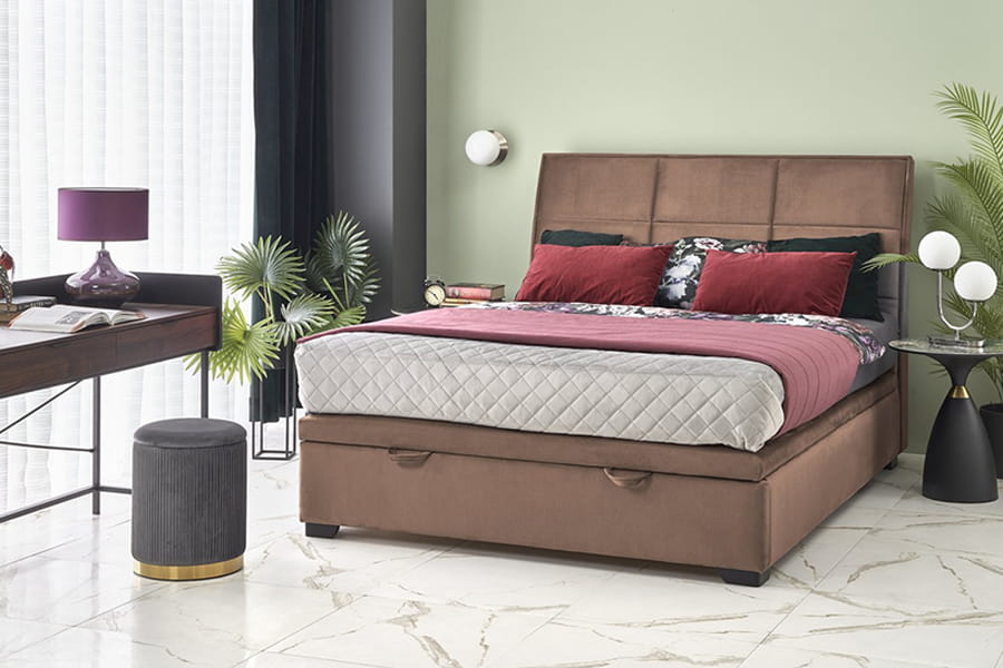 Łóżko z pojemnikiem na pościel, materiał: tkanina - velvet / drewno lite, kolor: beżowy, łóżko bez materaca, w opcji materac POLARIS 160 lub SYRIUSZ 160