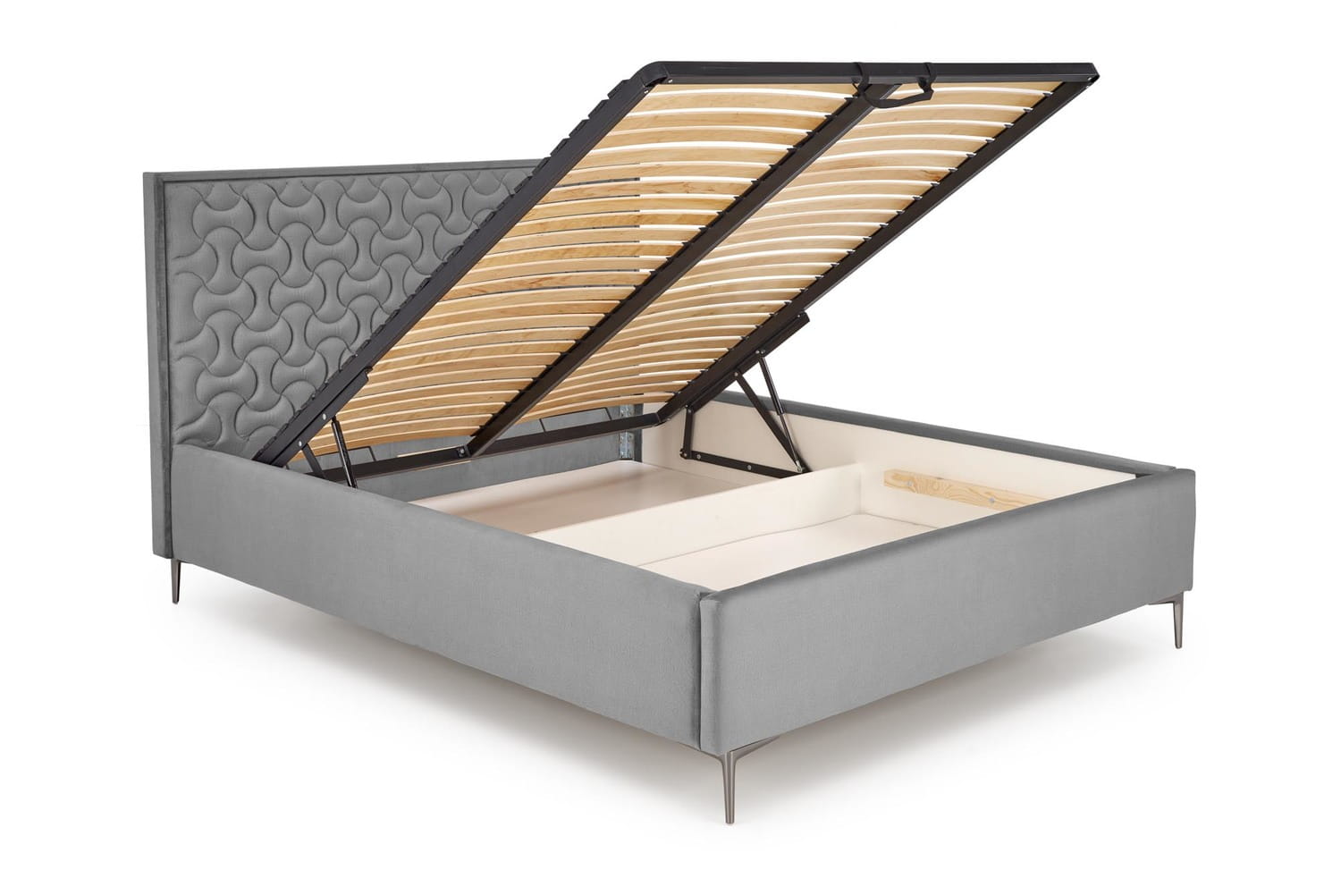 Łóżko Modulo z pojemnikiem na pościel zapewniającym dodatkowe miejsce do przechowywania co jest istotne szczególnie w małym mieszkaniu gdzie każdy schowek jest na wagę złota. Łóżko posiada mocny stelaż pod materac, który podnosimy dzięki zastosowaniu podnośników. Odstęp między listwami stelaża to tylko 6cm. Tak gęste zastosowanie listew sprawia, że jest on odpowiedni pod niemal każdy materac o powierzchni 160x200cm wytrzymując również duże obciążenie.