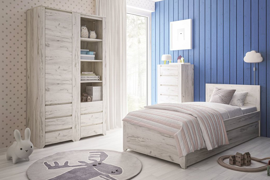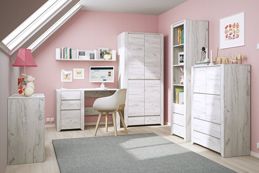 Nie wiesz, jak zaaranżować pokój dziecka? Ciągle zmieniasz koncepcję, szukając mebli w uniwersalnym, neutralnym kolorze, który pasuje do każdej stylizacji? Kolekcja Angel jest stworzona właśnie dla Ciebie. Dzięki eleganckiemu dekorowi Dębu White Craft, inspirowanemu bielonym drewnem, seria ta doskonale wkomponuje się w każde wnętrze, niezależnie od wieku dziecka. W ofercie znajdziesz nawet łóżeczko niemowlęce z regulacją wysokości materaca. Marzysz o stworzeniu przytulnej atmosfery? Postaw na delikatne kolory i subtelne wzory. Jeśli unikasz białych ścian, wybierz pastelowe barwy! Jasne odcienie błękitu, różu czy zieleni podkreślą dziecięcy klimat i sprawią, że pokój stanie się spokojnym miejscem do nauki i zabawy.