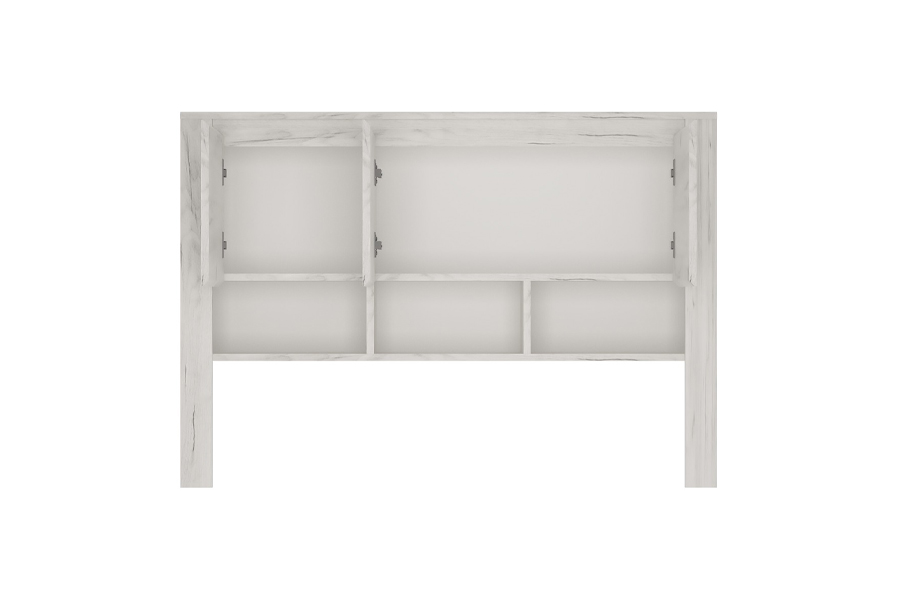 - Nadstawka wyposażona jest w trzy otwarte półki i dwie schowane za frontami przegrody.