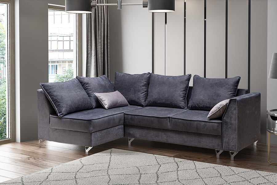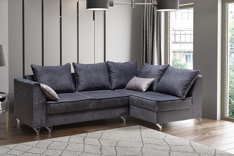 Narożnik Amber to idealne rozwiązanie do mniejszych pomieszczeń. Wyposażony w praktyczną funkcję spania oraz pojemnik na pościel posiada wygodne, szerokie siedzisko oraz komfortowe oparcie. Narożnik uzupełniony jest dwoma poduchami dekoracyjnymi. Model dostępny jest także w większej wersji.