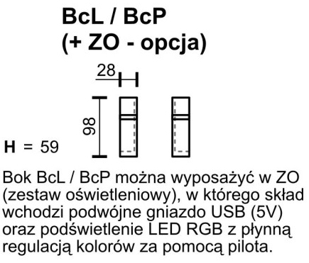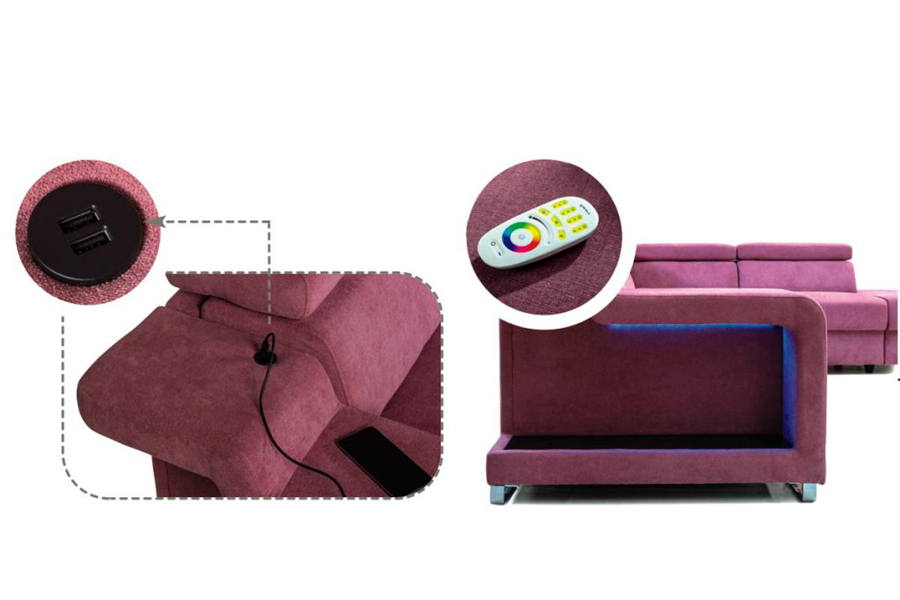 - bok wyposażony jest dodatkowo w „zestaw oświetleniowy”, składający się z podwójnego gniazda USB (5V) i podświetlenia ledowego RGB z płynną regulacją kolorów za pomocą pilota