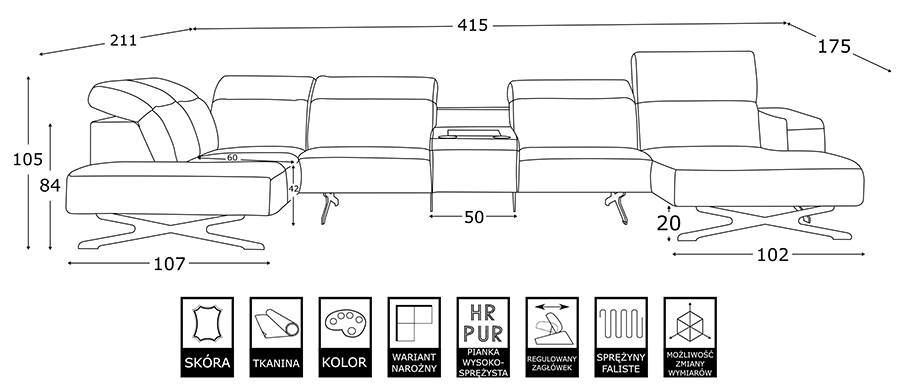Narożnik modułowy ARQUEEN to mebel dla wszystkich zwolenników komfortu i dobrego stylu. Wykonany jest dla tworzenia niebanalnych aranżacji dużych przestrzeni który doskonałe sprawdzi się dla dużej rodziny. Posiada przestronną, komfortową powierzchnię, na której cała rodzina ma zapewnioną absolutną wygodę. Narożnik ARQUEEN ma 415 cm szerokości, 211-175 cm głębokości i 84-103 cm wysokości. Mimo że to rozbudowany mebel tapicerowany, jego zgrabna sylwetka nadaje wnętrzu lekkości. Mistrzowskie wykonanie sprawia, że doskonale sprawdza się podczas codziennego użytkowania. Wyjątkową wygodę zapewniają regulowane zagłówki oraz zastosowana w siedziskach sprężyna falista i pianka wysokoelastyczna. Jego oparcia świetnie dopasowują się do wymagań dzięki najwyższej jakości silikonowemu wypełnieniu. Narożnik dostępny jest w szerokiej palecie tkanin obiciowych oraz skór naturalnych.