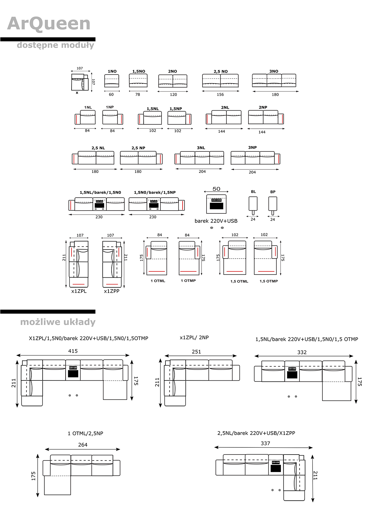 - narożnik modułowy bez funkcji spania i pojemnika na pościel