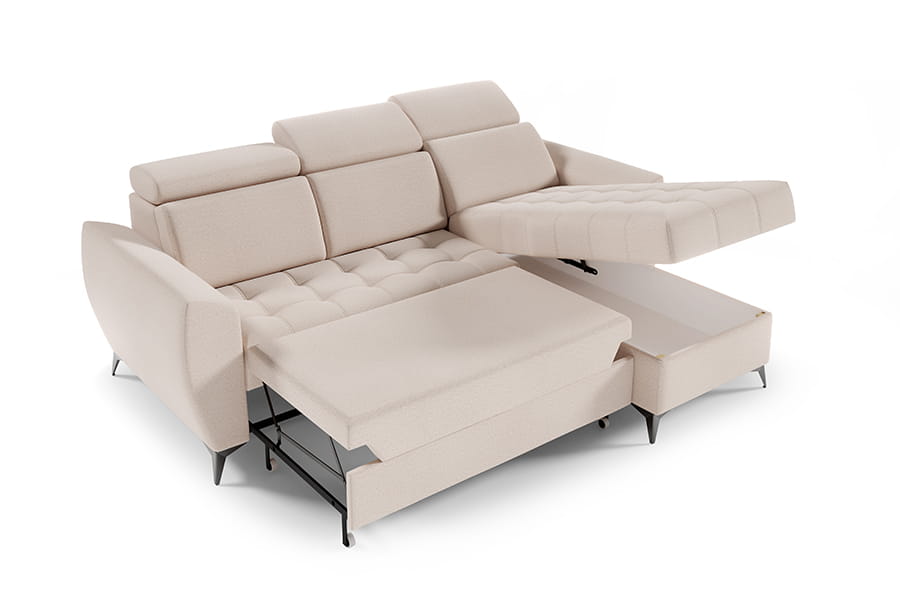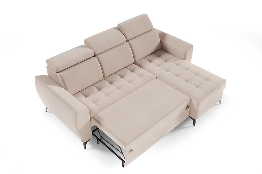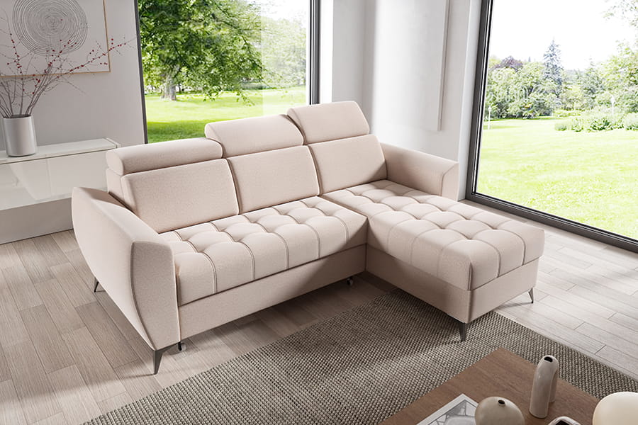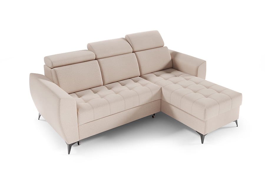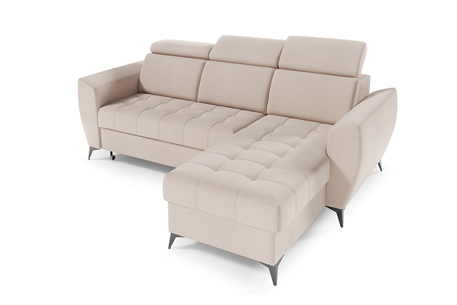 Narożnik Atlanta I to mebel łączący funkcjonalność i nowoczesność. Mebel posiada regulowane zagłówki, co podnosi komfort użytkowania. Narożnik jest wyposażony w pojemnik na pościel, dzięki któremu zyskujemy dodatkowe miejsce do przechowywania wszelkich niezbędnych tekstyliów. Po rozłożeniu narożnika zyskujemy wygodne miejsce do spania. Korpus narożnika osadzony został na wysokich nóżkach, co nadaje mu lekkości. Siedzisko narożnika posiada modne pikowanie. Świetnie sprawdzi się w każdym pomieszczeniu, dzięki swojej funkcjonalności oraz nowoczesności. W celu zapewnienia jak największej wygody w produkcji narożnika wykorzystano piankę wysokoelastyczną oraz sprężyny faliste typu B, dzięki czemu narożnik jest niezwykle komfortowy. Narożnik to mebel uniwersalny to Ty decydujesz o stronie narożnika.