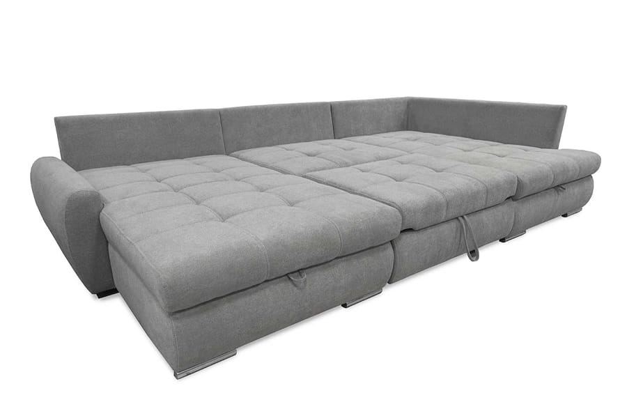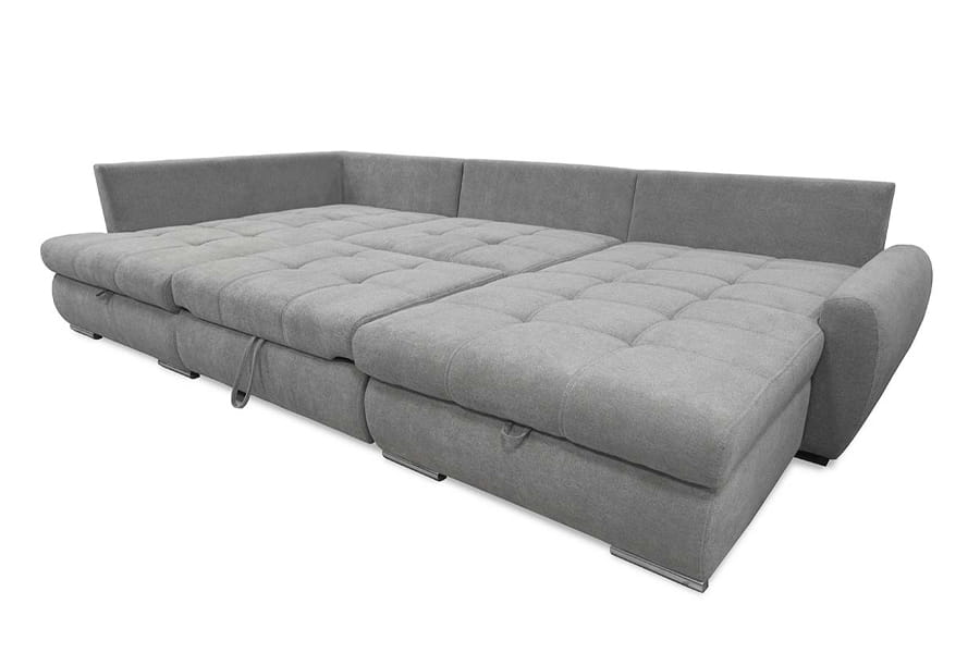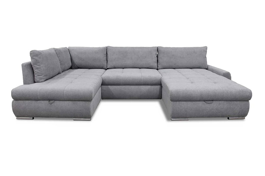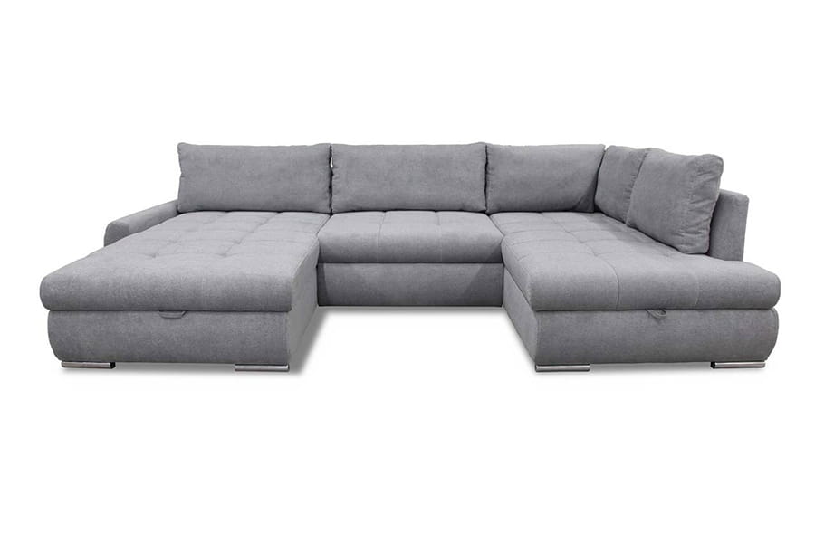 Nowoczesny narożnik CANYON U to odpowiedni narożnik do większego salonu. Solidny, wytrzymały, w kształcie litery U idealnie będzie pasować do nowoczesnych, przestrzennych wnętrz. Dzięki swojej wysokiej funkcjonalności jest jednym z naszych faworytów! Pozwoli Ci zrelaksować się po ciężkim dniu w pracy. Wyposażony w dwa pojemniki na pościel w otomanie. Dopełnia całą stylizację eleganckimi nóżkami z tworzywa sztucznego w kolorze chromu. Narożnik CANYON to połączenie stylu, prostego designu, ale również funkcjonalności. Stworzony specjalnie na potrzeby nowoczesnych rozwiązań! Został wykonany z najwyższej jakości materiałów, które zapewniają trwałość na długie lata użytkowania. Kanapa narożna w kształcie litery U to uniwersalny mebel. Nie musisz podawać żadnej strony. Narożnik został wyposażony w funkcję spania z systemem rozkładania DL. Aby rozłożyć narożnik należy lekko podnieść siedzisko do góry i przesunąć do przodu. W tym przypadku środkowa część się rozkłada. Siedzisko wypełnione najlepszą gatunkowo pianką oraz sprężynami falistymi. Obszerne i stylowe przeszycia na siedzisku przyciągają wzrok i dodaje uroku. Oparcie narożnika jest tapicerowane, a za podparcie Twoich pleców odpowiada 5 luźnych poduszek.