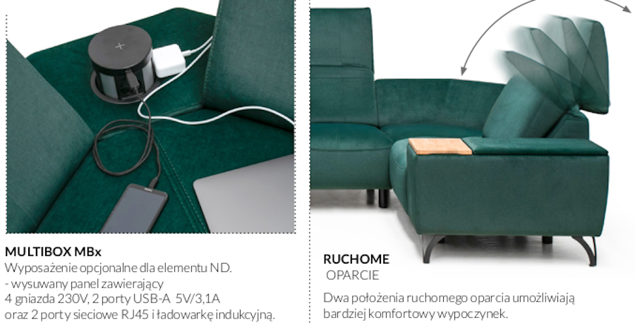 W modelu „Daiano”, dzięki oryginalnemu mechanizmowi unoszenia poduszek oparciowych można uzyskać dwie konfiguracje oparć, co pozwala na wybranie ulubionej pozycji do relaksu. Ozdobą modelu są stabilne metalowe nóżki chromowane, a prześwit o wysokości 14 cm nadaje sofie lekkości. Możliwość wykonania w skórze i w tkaninie. Komfort i należytą wygodę zapewniają zastosowane wysokoelastyczne pianki, sprężyny bonellowe i sprężyny faliste.