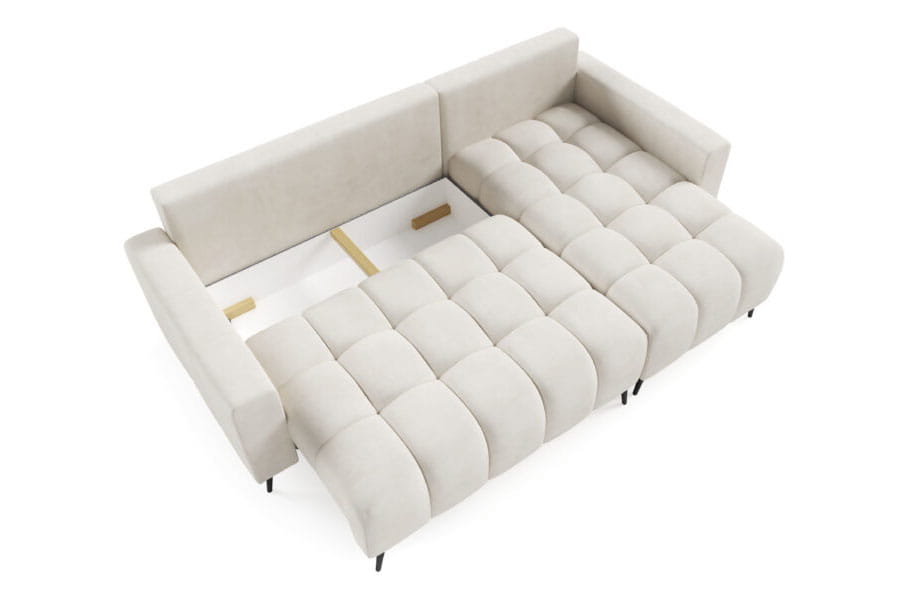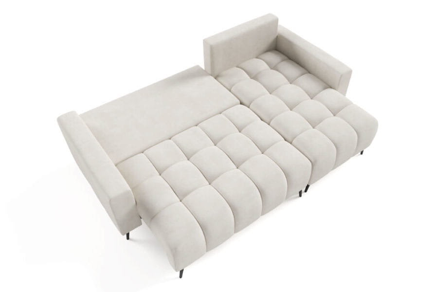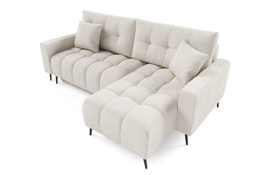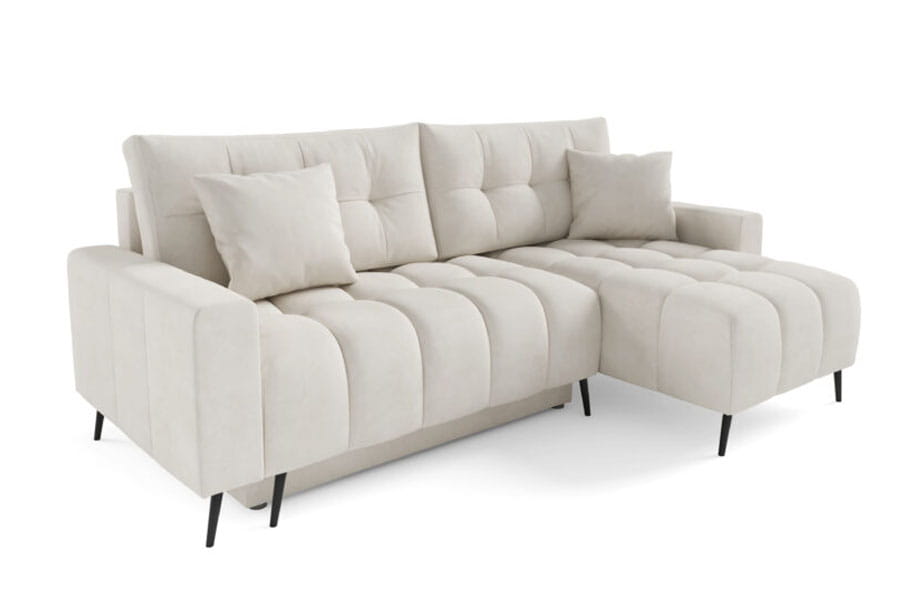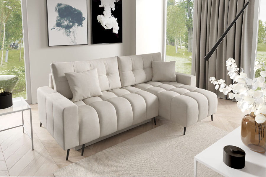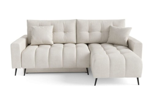 Narożnik Dakota Mini to kompaktowy, nowoczesny mebel, który łączy styl z funkcjonalnością. Wyposażony w system rozkładania DL, pozwala na szybkie przekształcenie go w wygodne miejsce do spania. Pojemnik na pościel oferuje dodatkowe miejsce do przechowywania. Narożnik wyróżnia się unikalnym wzorem siedziska, który nadaje mu wyjątkowego charakteru. Dwie duże pikowane poduszki oraz dwie mniejsze poduszki zapewniają komfort i elegancję. Industrialne nogi dodają nowoczesnego akcentu, a miła w dotyku tapicerka gwarantuje wygodę użytkowania.