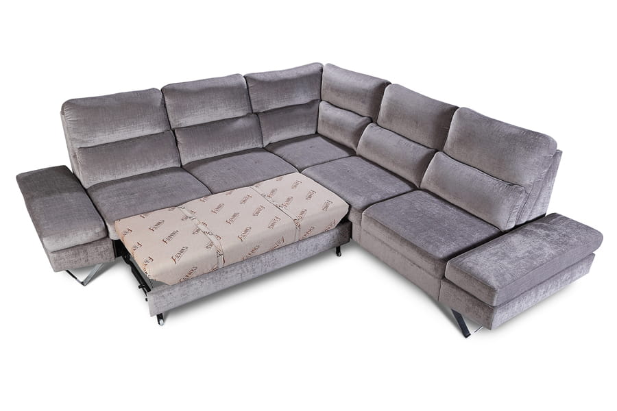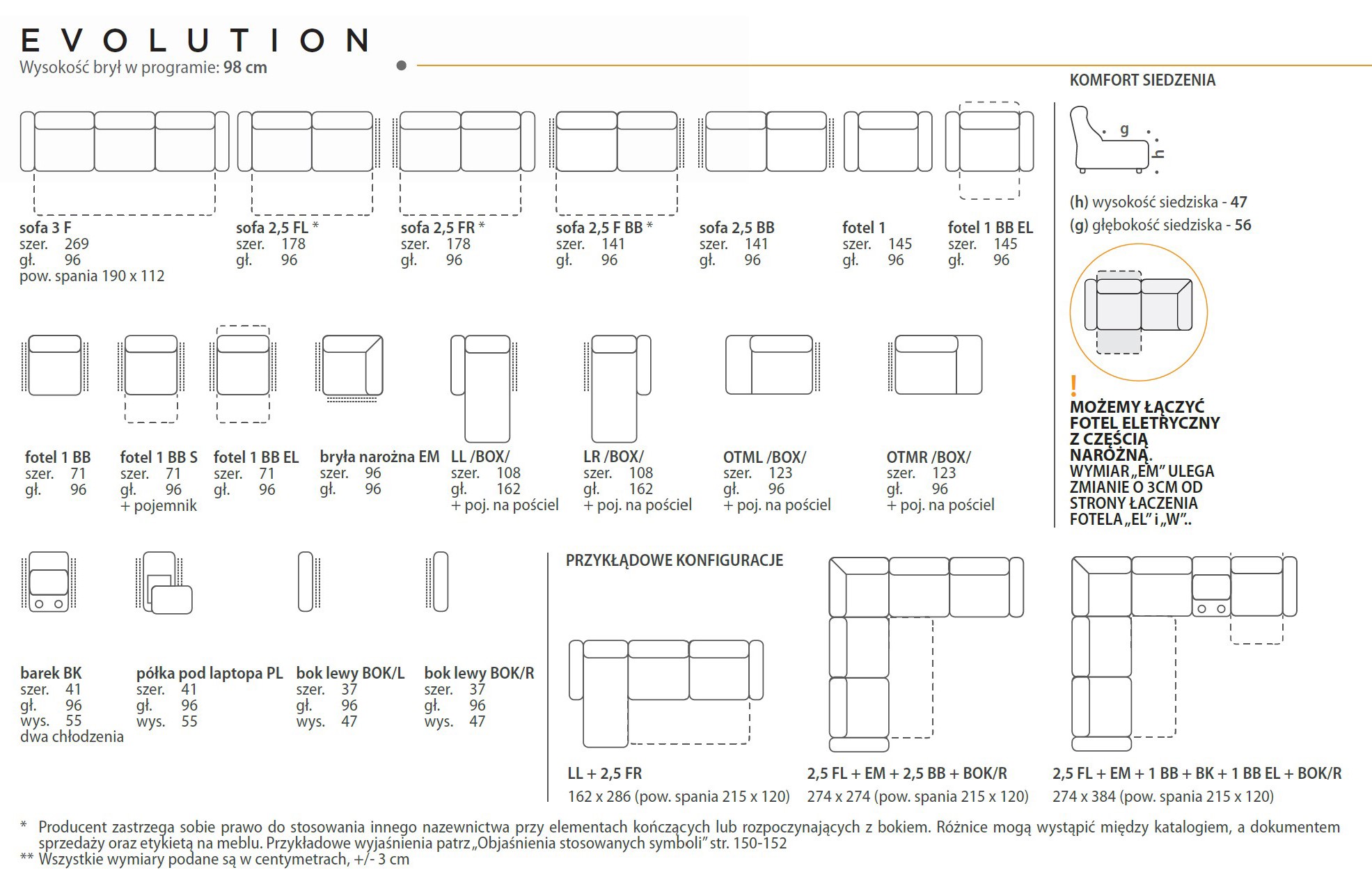 Kolekcja Evolution to meble modułowe, z którymi można stworzyć niewielką sofę idealną do mniejszych pomieszczeń jak i obszerny narożnik idealny do dużego oraz przestronnego salonu. Meble posiadają szereg funkcji, które zwiększają komfort użytkowania podnosząc jednocześnie wartość praktyczną kolekcji jak funkcja spania, fotel z funkcją relaksu elektrycznego, półka pod laptop, barek z dwoma chodziarkami oraz schowek na pościel. Narożnik Evolution to wielofunkcyjny mebel wyposażony w praktyczne i funkcjonalne rozwiązania jak komfortowy fotel z elementem prostokątnym wyposażonym w półkę oraz otwierany pojemnik na pościel. Narożnik jest przykładem nowoczesnego wzornictwa połączonego z najlepszym komfortem oraz funkcjonalnością. Geometryczna bryła stoi na charakterystycznych, chromowanych płozach, które dodają jej elegancji, podkreślając nowoczesny design mebla. Funkcja spania z wygodnym mechanizmem rozkładania typu delfin a także regulowane podłokietniki to udogodnienia, które sprostają oczekiwaniom nawet największych miłośników wygody i komfortu.
