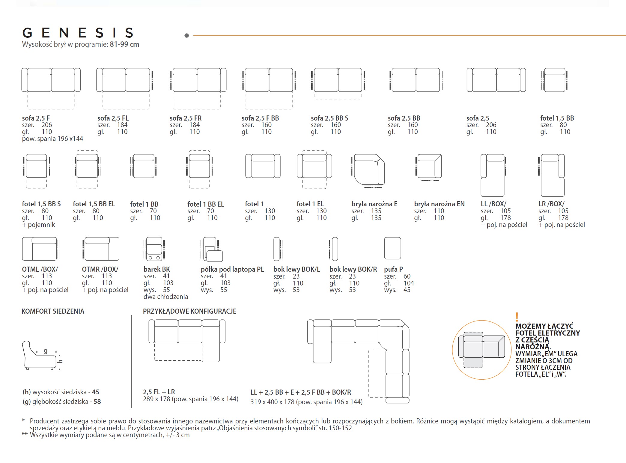 Kolekcja GENESIS to meble o nowoczesnym designie i kubistycznych kształtach, które zachowują wysoki komfort użytkowania. Ergonomicznie wyprofilowane oparcia odciążają zmęczone plecy, a wysokie, regulowane zagłówki podtrzymują głowę i pozwalają odpocząć szyi i barkom. Siedziska wykonane na bazie wysoko- elastycznej pianki HR (High Resiliense Foam) i sprężyn falistych dają poczucie optymalnej elastyczności, zapewniając jednocześnie długą żywotność (sprężystość) siedziska. W kolekcji znajdą Państwo elementy wolnostojące: fotele, sofy oraz moduły, które umożliwiają konfigurowanie mebli o wymiarach i funkcjach dopasowanych do Państwa potrzeb i oczekiwań.
