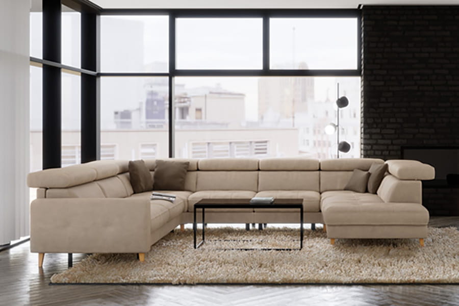 - mebel tapicerowany w tkaninie i skórze naturalnej
