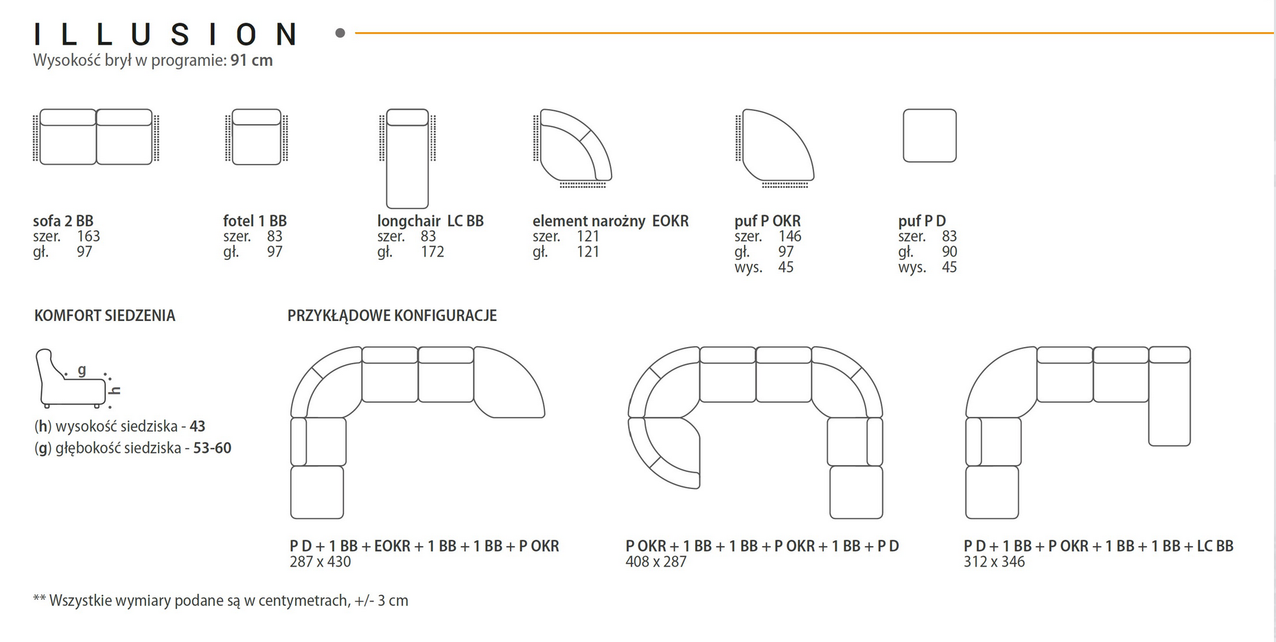 Ergonomiczne siedzenie przy zestawieniu z dobrze wyprofilowanym oparciem jest znakomitą odpowiedzią na zmęczenie, które dopada pod koniec pracowitego dnia, a bryła „longchair” to kwintesencja tego czym jest tzw. redukcja wyczerpania ciężką pracą. Powierzchnia siedzenia ILLUSION jest nie tylko komfortowa w swojej miękkości ale również praktyczna w potrzebie wypoczynku. Cały program został zbudowany na specjalnie do tego dobranych sprężynach siedzenia jak również drewna liściastego i wysoko elastycznych piankach poliuretanowych testowanych szczególnie to tego typu (modułowych) mebli.