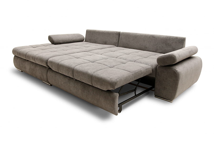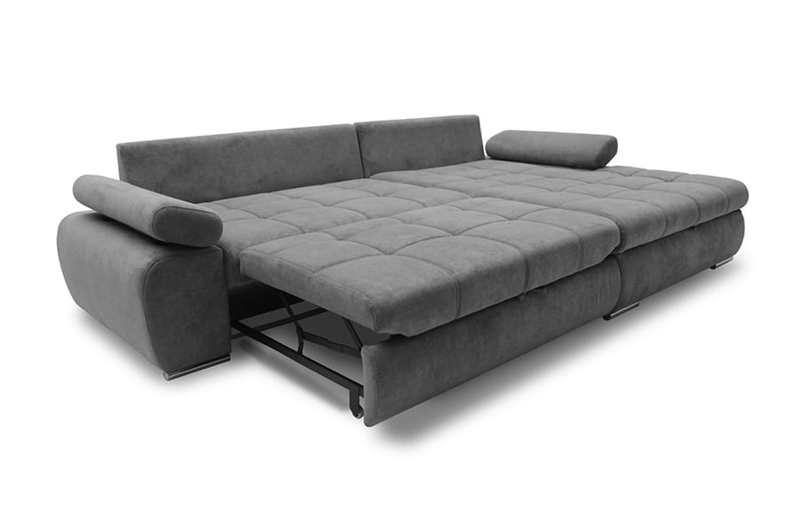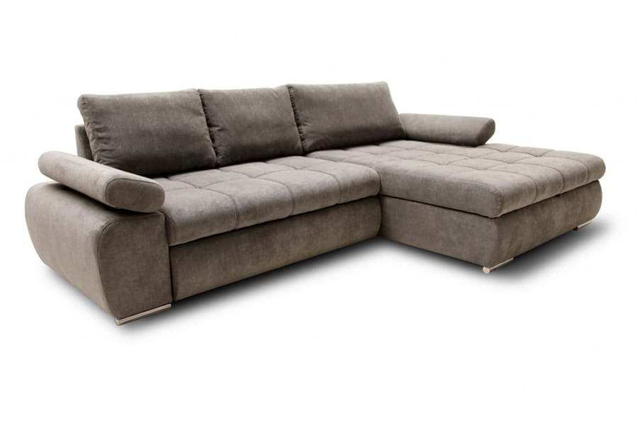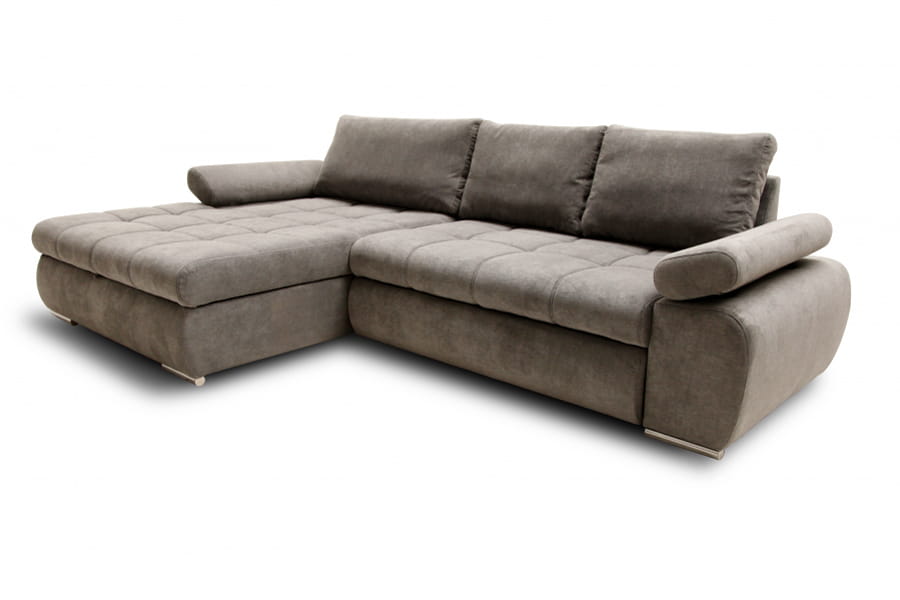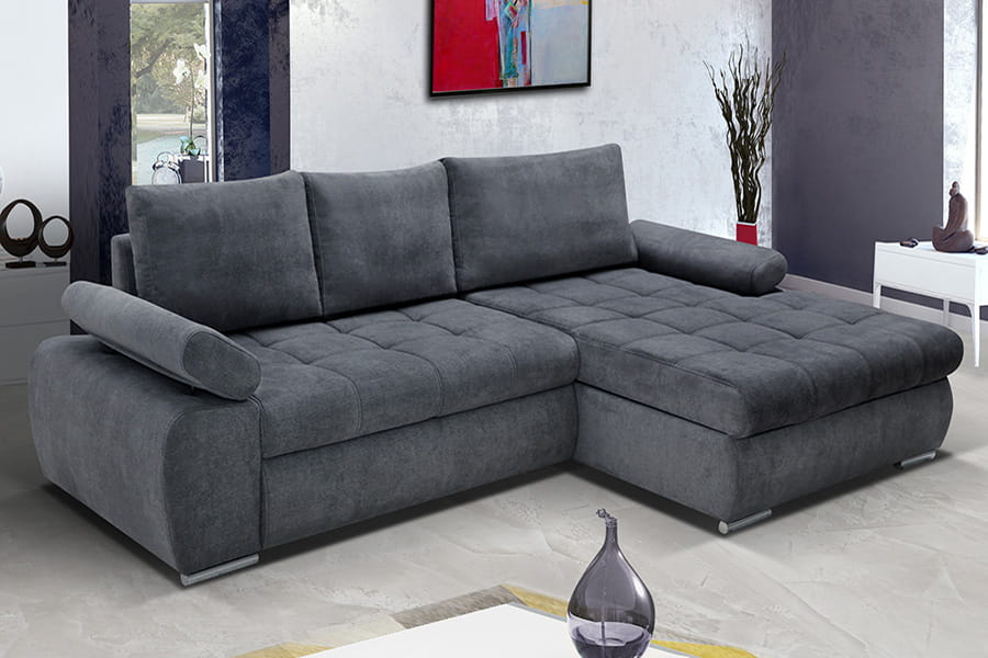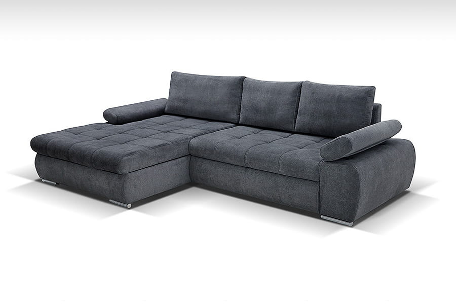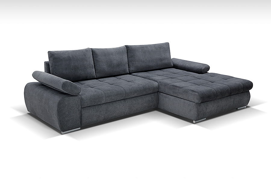 Nowoczesny narożnik Inferno wyróżnia się opływowym kształtem oraz licznymi przeszyciami na siedzisku, które nadają mu wyjątkowo modnego akcentu. Narożnik posiada ruchome podłokietniki oraz trzy funkcjonalne poduchy oparciowe zwiększające komfort wypoczynku. Ponadto ten funkcjonalny mebel rozkłada się do spania, co będzie bardzo przydatne podczas wizyty gości, a praktyczny pojemnik pod siedziskiem będzie idealnym miejscem na przechowywanie pościeli. Użycie wysokogatunkowych materiałów – sprężyny falistej oraz pianki poliuretanowej HR gwarantują niebywały komfort wypoczynku.