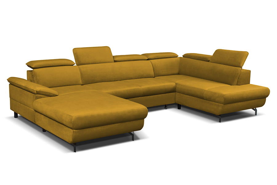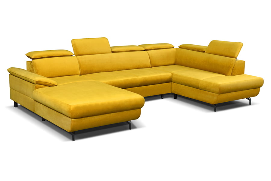 - narożnik w kształcie litry U z funkcją spania ( typu „DELFIN” jest mechanizmem stosowanym zazwyczaj w narożnikach. Ze względu na brak możliwości połączenia funkcji z pojemnikiem na pościel, pojemnik ten znajduje się pod drugą częścią narożnika. Rozłożenie powierzchni spania polega na wysunięciu, za pomocą specjalnego uchwytu, zamontowanego na rozsuwanej konstrukcji materaca, który prostym ruchem zrównuje się z siedziskiem mebla. Tak skonstruowana funkcja gwarantuje stabilny i wygodny wypoczynek. )