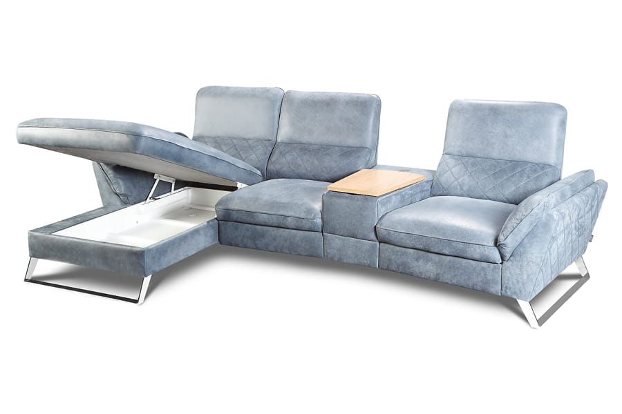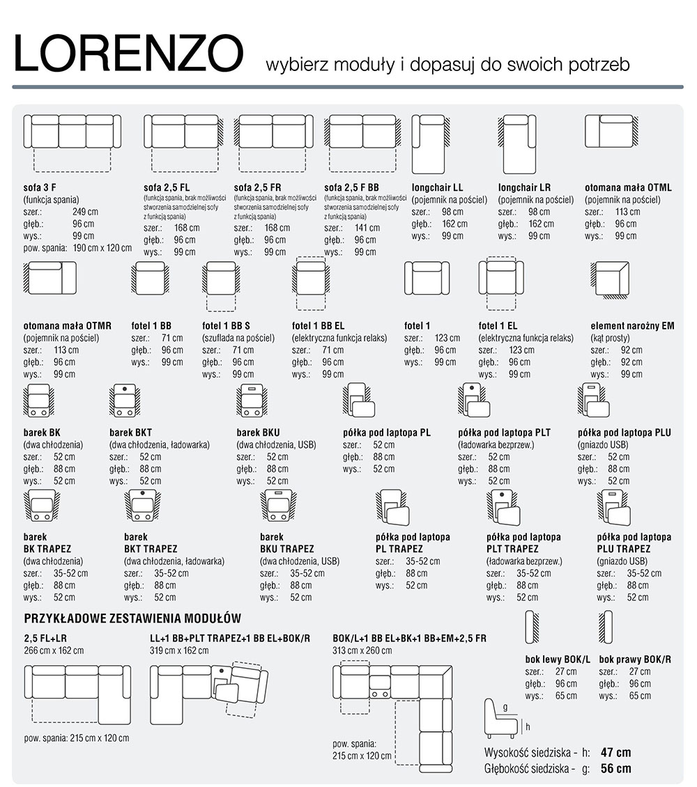 Kolekcja Lorenzo to meble modułowe, z którymi można stworzyć niewielką sofę idealną do mniejszych pomieszczeń jak i obszerny narożnik idealny do dużego oraz przestronnego salonu. Meble posiadają szereg funkcji, które zwiększają komfort użytkowania podnosząc jednocześnie wartość praktyczną kolekcji jak funkcja spania, fotel z funkcją relaksu elektrycznego, regulowane zagłówki, półka pod laptop, ładowarka do telefonu oraz pojemniki i schowki. Narożnik Lorenzo to wielofunkcyjny mebel wyposażony w praktyczne i funkcjonalne rozwiązania jak komfortowy fotel z elementem prostokątnym wyposażonym w półkę oraz otwierany pojemnik na pościel. Narożnik dostępny jest w wersji prawej oraz lewej.