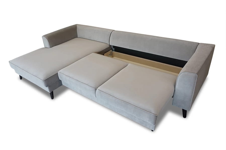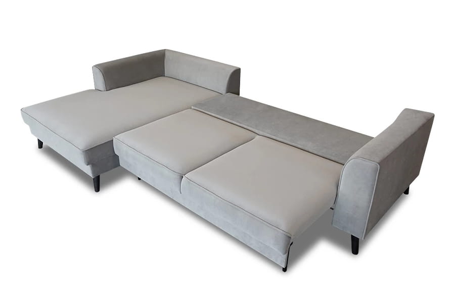 - narożnik z funkcją spania ( typu „DL” umożliwia rozłożenie mebla z wykorzystaniem jego oparcia. Jest to prosty mechanizm w którym, po ewentualnym zdjęciu poduch oparciowych, należy unieść siedzisko mebla do góry a następnie opuścić je do przodu. W przestrzeń powstałą w wyniku rozłożenia siedziska, należy położyć oparcie mebla. W taki sposób uzyskujemy bezproblemową w użytkowaniu funkcję spania, a także duży pojemnik na pościel )