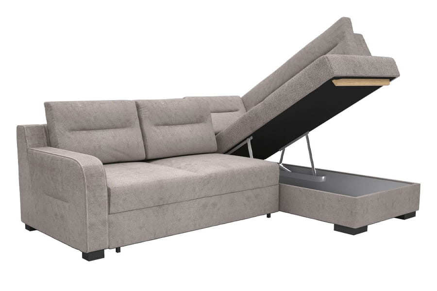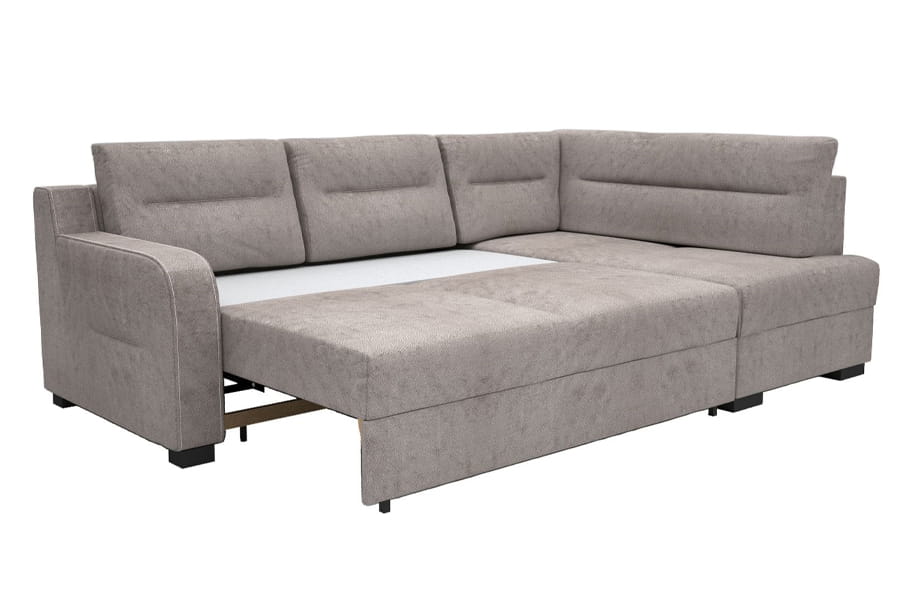 - narożnik z funkcją spania ( bardzo prosty system rozkładania stosowany w narożnikach. Jego atutem jest łatwe rozkładanie spania “jednym ruchem”. Rozkładanie polega na zdjęciu ewentualnych poduch oparciowych, a następnie uniesienie siedziska do góry i opuszczeniu w przód. Równocześnie, samoczynnie spod siedziska, wysuwa się druga powierzchnia do spania. Jest to przemyślane rozwiązanie ponieważ nie uszkadza podłogi podczas składania i rozkładania mebla. Nie trzeba składać oparcia, a mechanizm jest bardzo praktyczny i łatwy w obsłudze. )