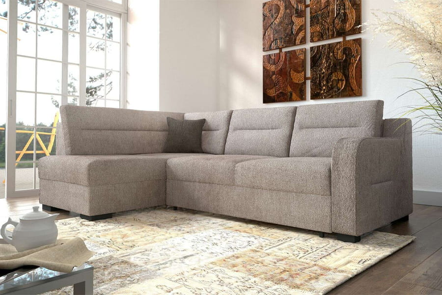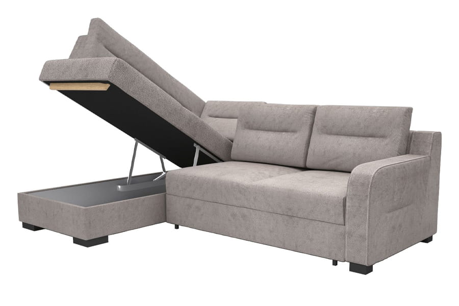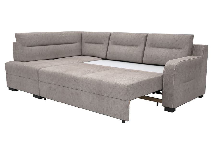 - narożnik z funkcją spania ( bardzo prosty system rozkładania stosowany w narożnikach. Jego atutem jest łatwe rozkładanie spania “jednym ruchem”. Rozkładanie polega na zdjęciu ewentualnych poduch oparciowych, a następnie uniesienie siedziska do góry i opuszczeniu w przód. Równocześnie, samoczynnie spod siedziska, wysuwa się druga powierzchnia do spania. Jest to przemyślane rozwiązanie ponieważ nie uszkadza podłogi podczas składania i rozkładania mebla. Nie trzeba składać oparcia, a mechanizm jest bardzo praktyczny i łatwy w obsłudze. )