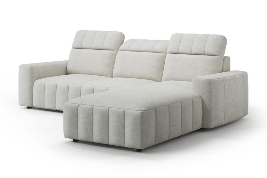 Narożniki to meble, które dostarczają codziennego komfortu dla całej rodziny. Bardzo szeroka oferta narożników od producenta MebloSoft to modele skierowane zarówno do najbardziej wymagających klientów ceniących wysoką jakość i komfort, jak również do poszukujących zgrabnej formy wypoczynku wyposażonego w liczne udogodnienia sprzyjające codziennemu funkcjonowaniu. Narożnik z funkcją spania i pojemnikiem na pościel, wykonany na sprężynie falistej. Siedzisko wypełnione pianką wysokoelastyczną HR. Posiada elementy ozdobne wykonane w kolorze czarnym. Nowoczesny mechanizm umożliwia rozłożenie mebla w dwóch pozycjach – relax, poprzez wysunięcie siedziska oraz do pozycji spania poprzez lekkie przesunięcie do przodu i uniesienie siedziska do góry.