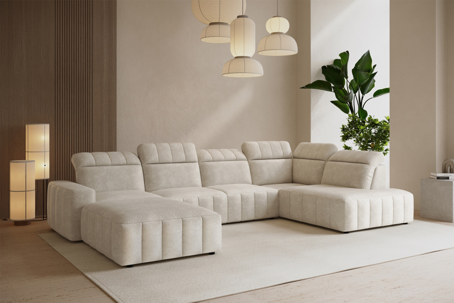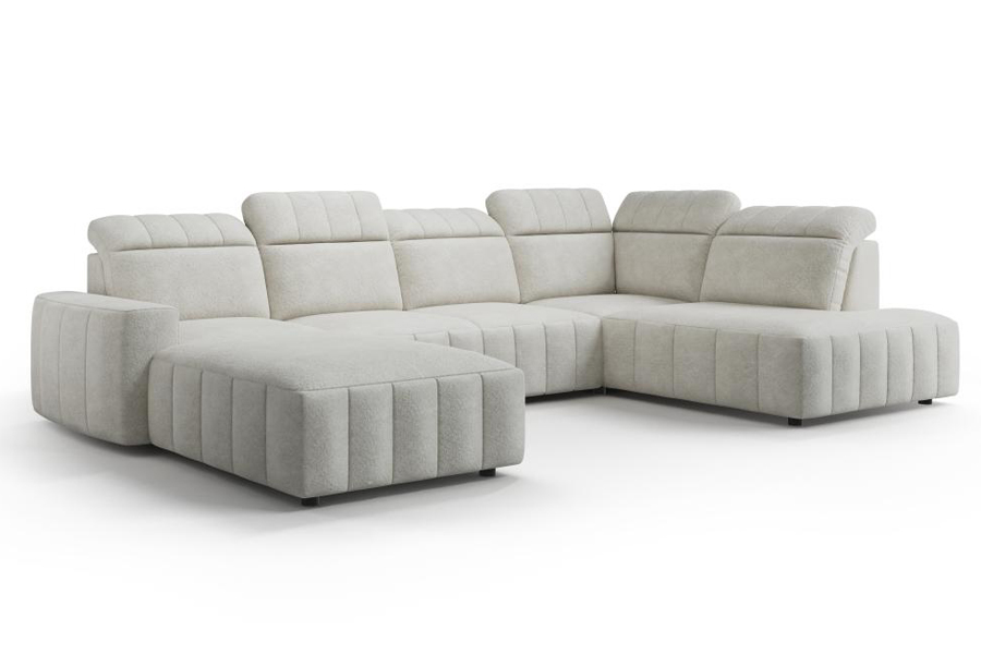 Narożnik Montreal został wykonany z myślą o osobach poszukujących dużej powierzchni wypoczynkowej oraz wygodnych rozwiązań codziennego użytku. Charakterystyczny kształt litery U o symetrycznym układzie ramion i szerokości 346 cm przy głębokości 199 cm po obu stronach sprawia, że mebel naturalnie wypełnia przestrzeń salonu. Standardową wysokość 88 cm można zwiększyć do 104 cm po rozłożeniu zagłówków. Subtelne pikowanie w części siedziska tworzy delikatną fakturę, która wyróżnia narożnik wśród klasycznych brył tapicerowanych. Siedzisko wypełniono sprężyną falistą oraz pianką wysokoelastyczną, natomiast oparcie wykonano wyłącznie z pianki wysokoelastycznej, co przekłada się na miękkość i stabilne podparcie ciała. Regulowane zagłówki pozwalają na dopasowanie wysokości do własnych potrzeb, zapewniając wygodniejsze oparcie zarówno podczas siedzenia, jak i leżenia. Zastosowana funkcja spania typu Delfin pozwala z łatwością przekształcić mebel w łóżko – wystarczy unieść i przesunąć siedzisko do przodu, by uzyskać jednolitą powierzchnię spania o wymiarach 205x156 cm. Mechanizm rozkładania typu Puma++ działa jak klasyczna funkcja Puma, ale wyposażony jest w długi wysuw z przedłużonym siedziskiem, co zapewnia jeszcze szybszy i bardziej intuicyjny sposób rozkładania – bez zbędnych czynności i bez użycia siły. Powierzchnia spania rozkłada się samoczynnie, w jednym ruchu, a cały proces wspomagany jest sprężynami, co eliminuje konieczność zdejmowania poduch oparciowych. Model oferuje możliwość wyboru strony – dostępny jest zarówno w wersji lewostronnej, jak i prawostronnej, co ułatwia dopasowanie narożnika do konkretnego układu wnętrza. Szeroka bryła zapewnia miejsce do siedzenia nawet dla większej liczby domowników lub gości.