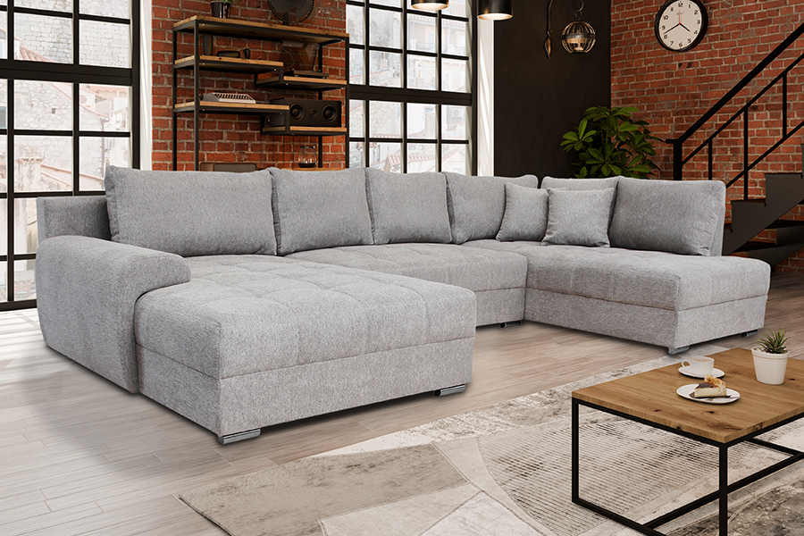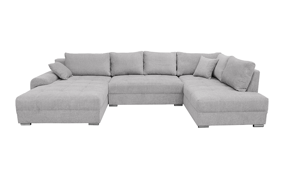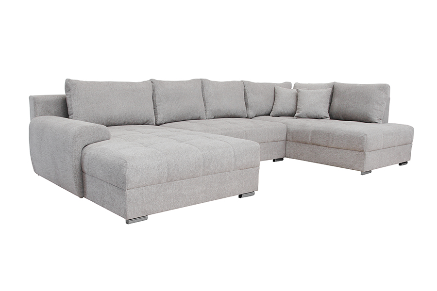 Nowoczesny narożnik NESO I U to odpowiedni narożnik do większego salonu. Solidny, wytrzymały, w kształcie litery U idealnie będzie pasować do nowoczesnych, przestrzennych wnętrz. Dzięki swojej wysokiej funkcjonalności jest jednym z naszych faworytów! Pozwoli Ci zrelaksować się po ciężkim dniu w pracy. Wyposażony w dwa pojemniki na pościel w otomanie. Dopełnia całą stylizację eleganckimi nóżkami z tworzywa sztucznego w kolorze chromu. Narożnik Neso I to połączenie stylu, prostego designu, ale również funkcjonalności. Stworzony specjalnie na potrzeby nowoczesnych rozwiązań! Został wykonany z najwyższej jakości materiałów, które zapewniają trwałość na długie lata użytkowania. Kanapa narożna w kształcie litery U to uniwersalny mebel. Nie musisz podawać żadnej strony. Narożnik został wyposażony w funkcję spania z systemem rozkładania DL. Aby rozłożyć narożnik należy lekko podnieść siedzisko do góry i przesunąć do przodu. W tym przypadku środkowa część się rozkłada. Siedzisko wypełnione najlepszą gatunkowo pianką oraz sprężynami falistymi. Obszerne i stylowe przeszycia na siedzisku przyciągają wzrok i dodaje uroku. Oparcie narożnika jest tapicerowane, a za podparcie Twoich pleców odpowiada 6 luźnych poduszek w tym 2 dekoracyjne.