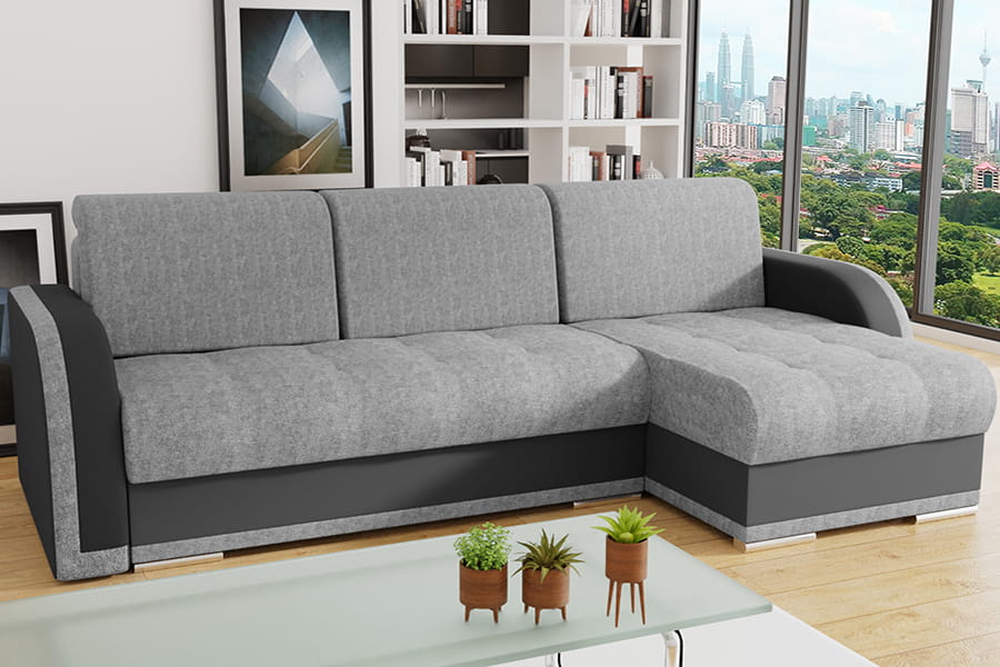 Narożnik Porto I Bis to świetna propozycja do modnie zaaranżowanego salonu. Doskonały komfort gwarantują luźne poduszki oparciowe oraz wysokie podłokietniki, a dzięki funkcji spania wraz z dwoma pojemnikiemi na pościel narożnik stworzy praktyczne i komfortowe miejsce do noclegu dla gości. Mebel jest uniwersalny – otomanę można zamontować zarówno po stronie prawej, jak i lewej.