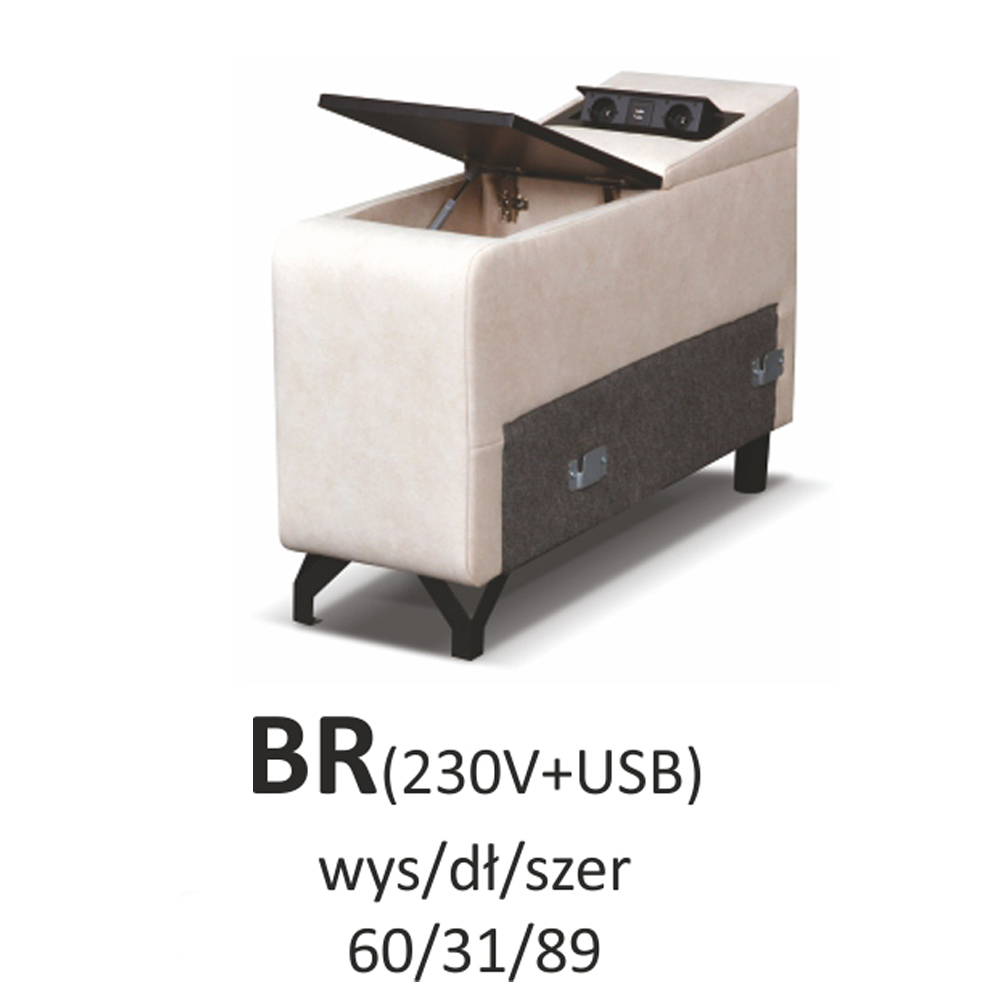 - moduł z pojemnikiem z wbudowanymi gniazdami 230V oraz portami USB