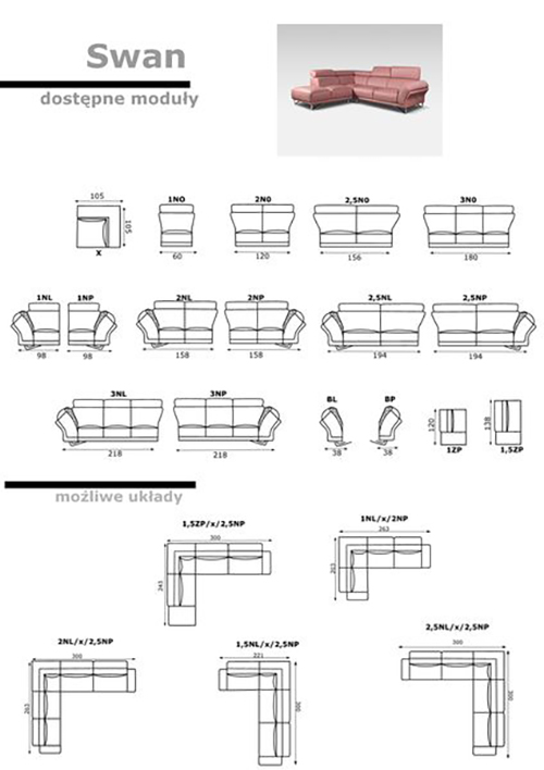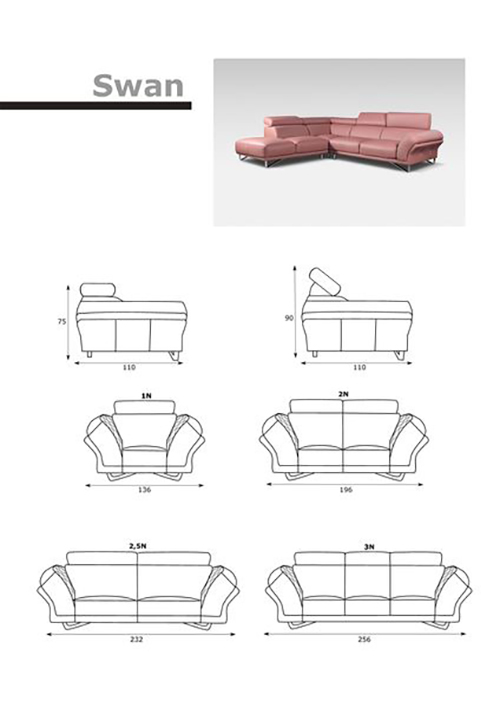 Swan to zestaw nowoczesnych mebli wypoczynkowych składający się z fotela, sofy 2 i sofy 3. Meble dostępne są w tapicerowaniu skórą naturalną oraz w tkaninach. Istnieje możliwość modyfikacji wymiarów poszczególnych elementów. W standardzie jest także możliwość przeszycia kontrastowymi nićmi.