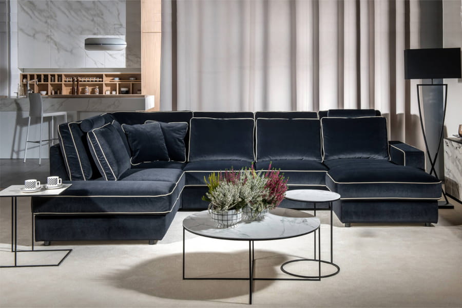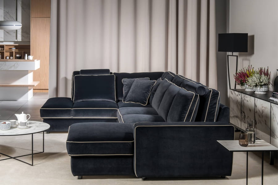 Jak jeszcze bardziej podnieść komfort wypoczynku? Naprawdę łatwo – do siedziska każdego modułu narożnika dodaliśmy dodatkowe poduszki ZX57, a do elementu narożnego trzy kwadratowe ZX57K. Dodatkowe poduszki zmniejszą głębokość siedzisk do ok. 55 cm, a oparcie składające się z dwóch poduch zapewni siedzącemu duże poczucie komfortu. Wygodę wypoczynku na narożniku z pewnością zwiększą dodatkowe zagłówki w kształcie walca, których kołnierz umieszcza się między poduchami oparciowymi.