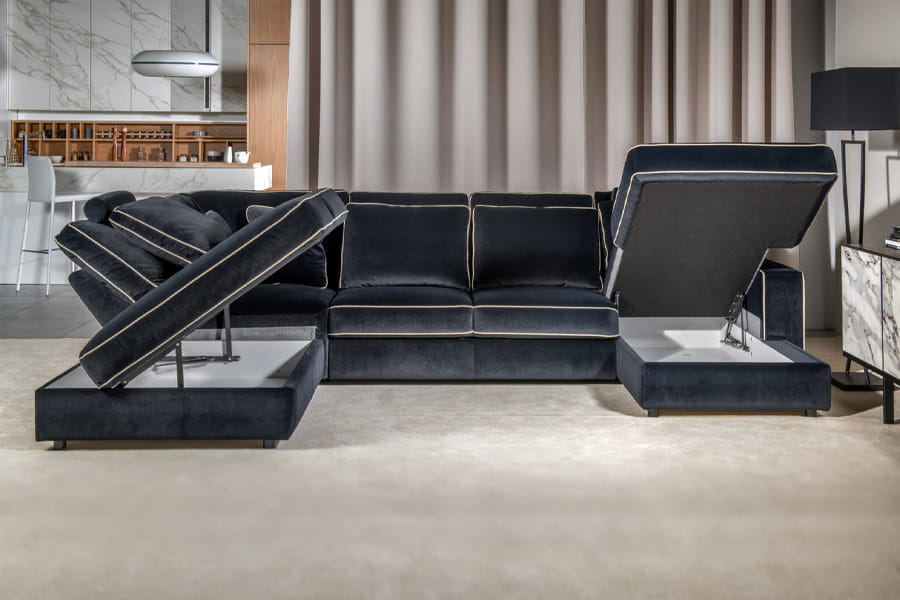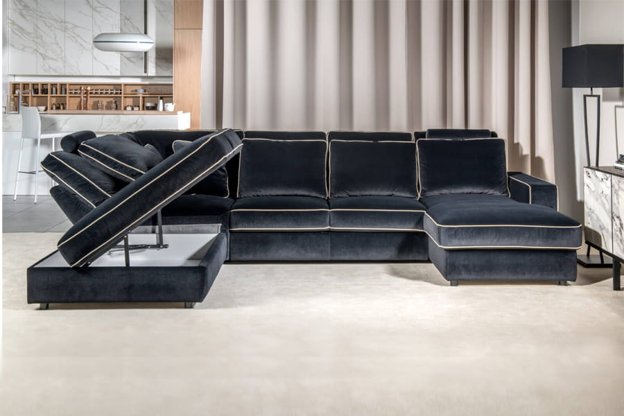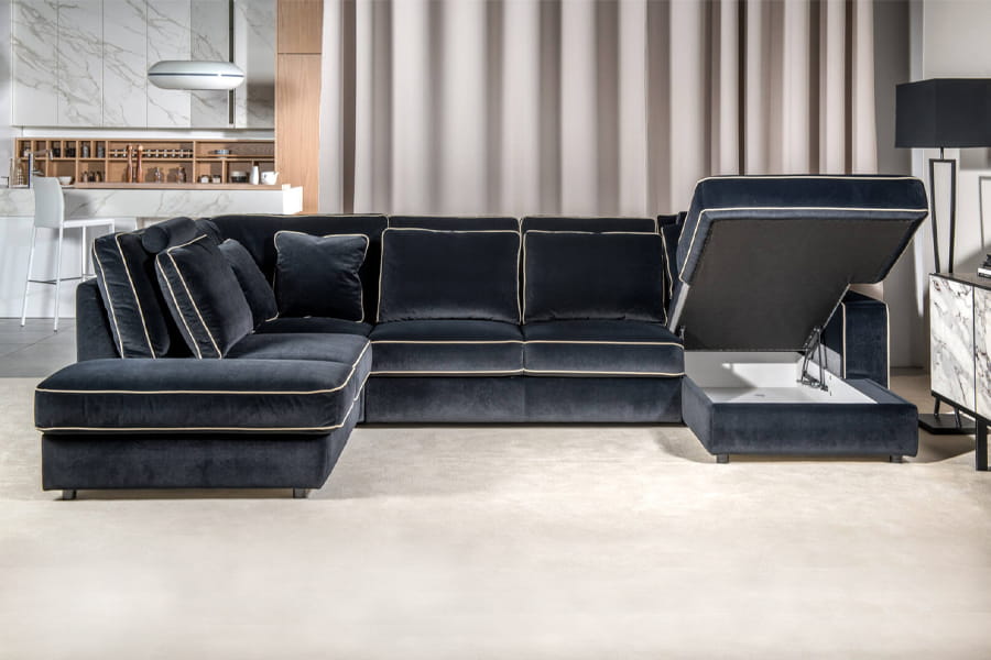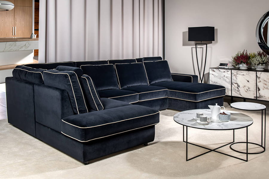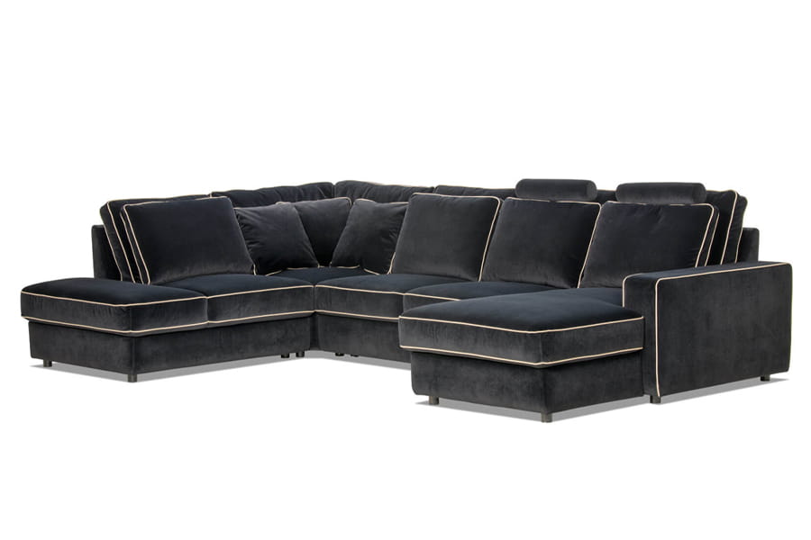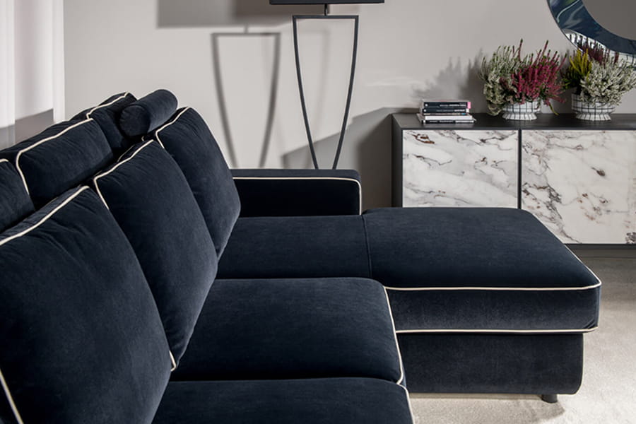 Wszystkie moduły użyte w narożniku mają siedziska wypełnione pianką HR – przyjemnie miękką, a jednocześnie odpowiednio sprężystą. A jego oparcia wyłożone są miękkimi poduszkami ze sztucznym pierzem (to długo zachowująca swe właściwości syntetyczna włóknina). Każde siedzisko modułu wyposażone jest w jedną poduszkę oparciową, wyjątkiem jest element narożny, który ma dwie takie poduszki.