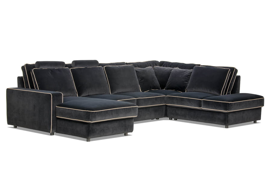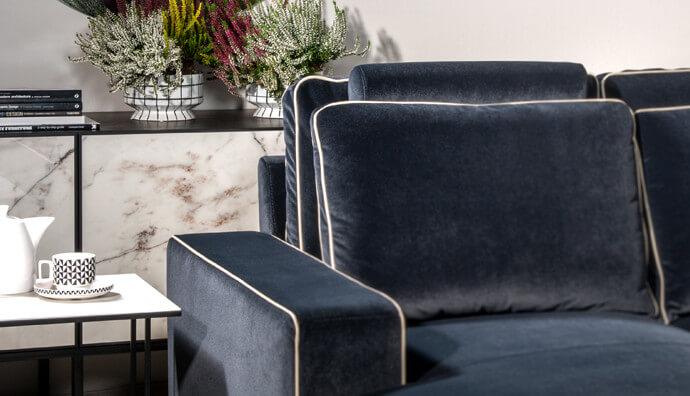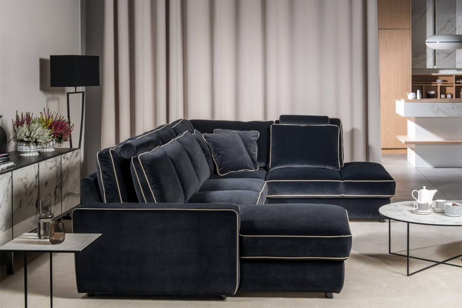 Jak jeszcze bardziej podnieść komfort wypoczynku? Naprawdę łatwo – do siedziska każdego modułu narożnika dodaliśmy dodatkowe poduszki ZX57, a do elementu narożnego trzy kwadratowe ZX57K. Dodatkowe poduszki zmniejszą głębokość siedzisk do ok. 55 cm, a oparcie składające się z dwóch poduch zapewni siedzącemu duże poczucie komfortu. Wygodę wypoczynku na narożniku z pewnością zwiększą dodatkowe zagłówki w kształcie walca, których kołnierz umieszcza się między poduchami oparciowymi.