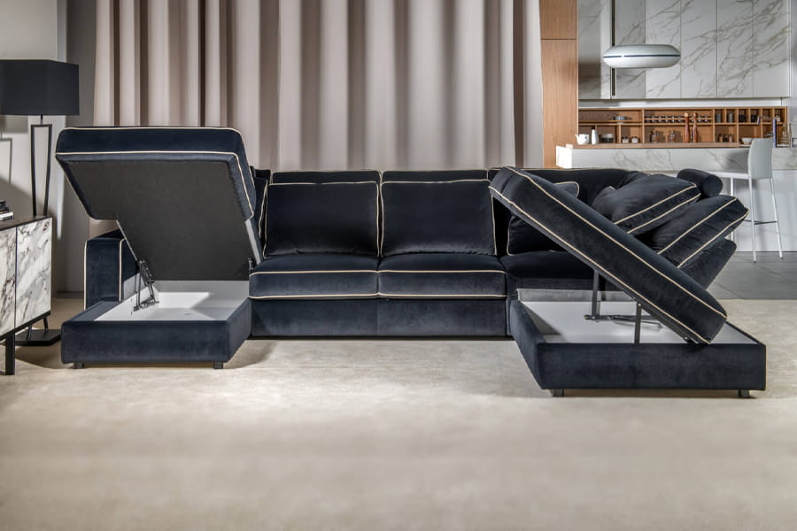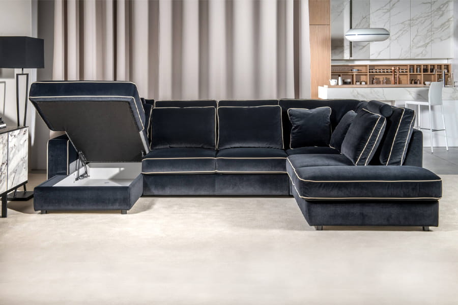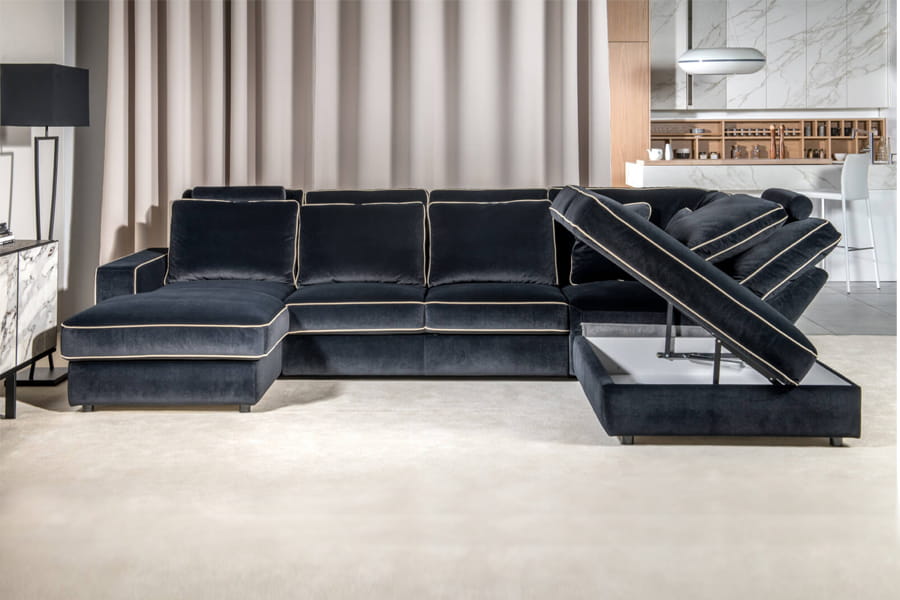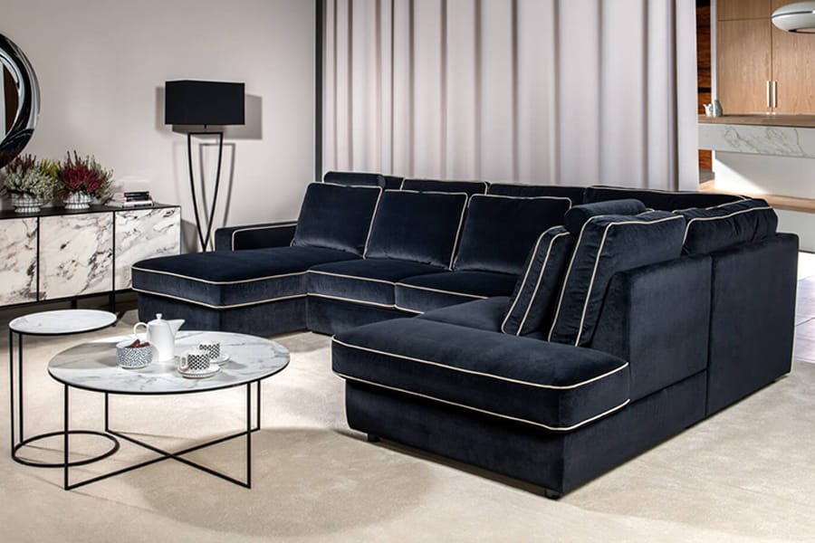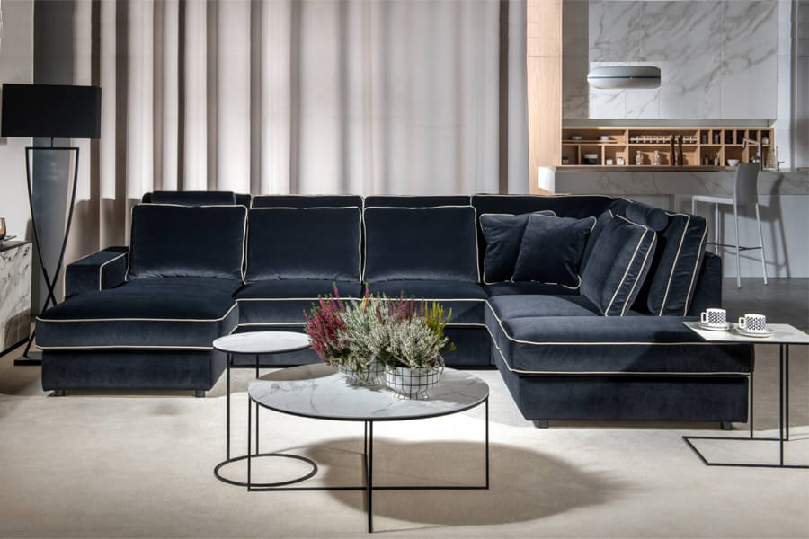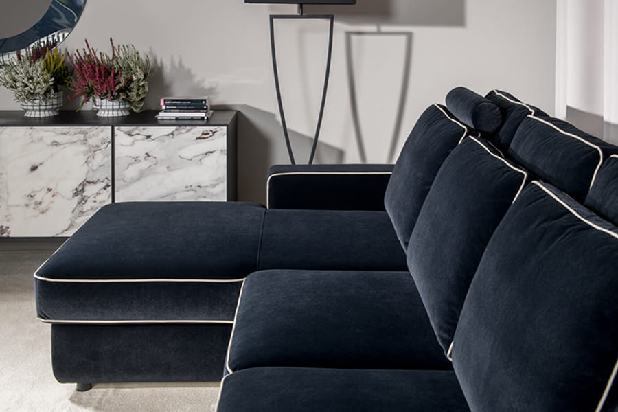 Wszystkie moduły użyte w narożniku mają siedziska wypełnione pianką HR – przyjemnie miękką, a jednocześnie odpowiednio sprężystą. A jego oparcia wyłożone są miękkimi poduszkami ze sztucznym pierzem (to długo zachowująca swe właściwości syntetyczna włóknina). Każde siedzisko modułu wyposażone jest w jedną poduszkę oparciową, wyjątkiem jest element narożny, który ma dwie takie poduszki.
