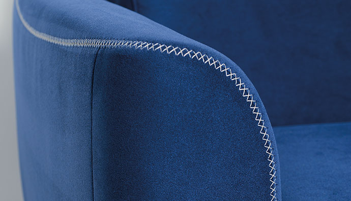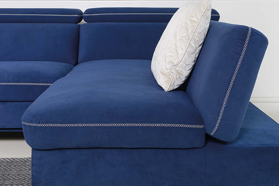 W narożniku wykonano precyzyjne przeszycia kontrastową nicią w kształcie litery "X" ( w kolorze ecru), która podkreśla niebanalny design mebla.