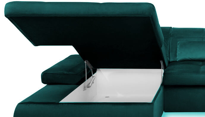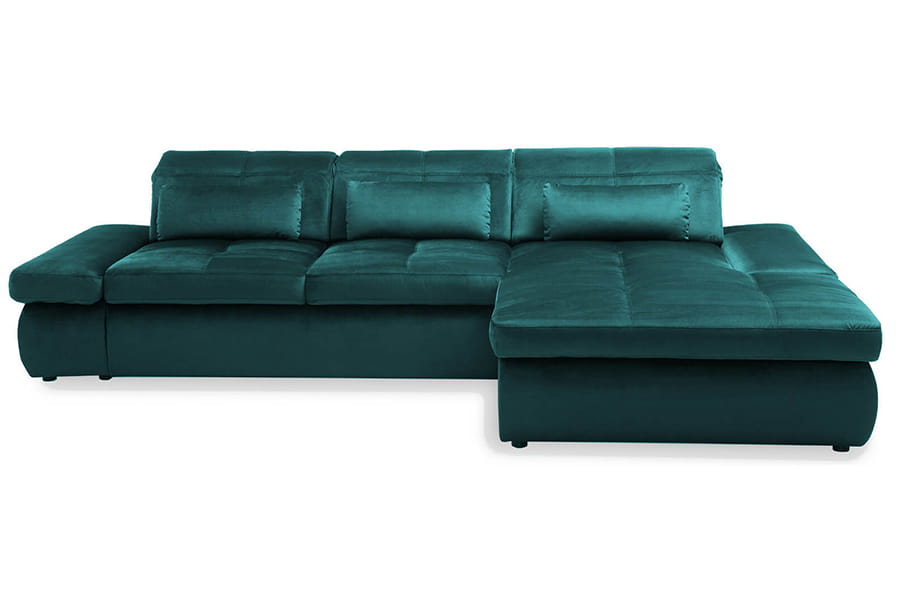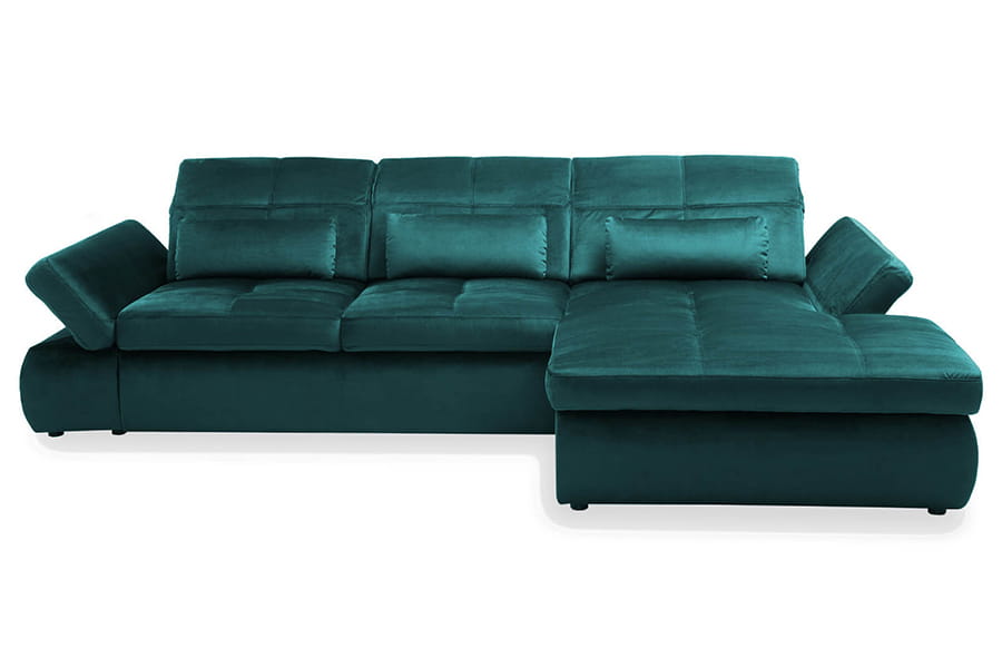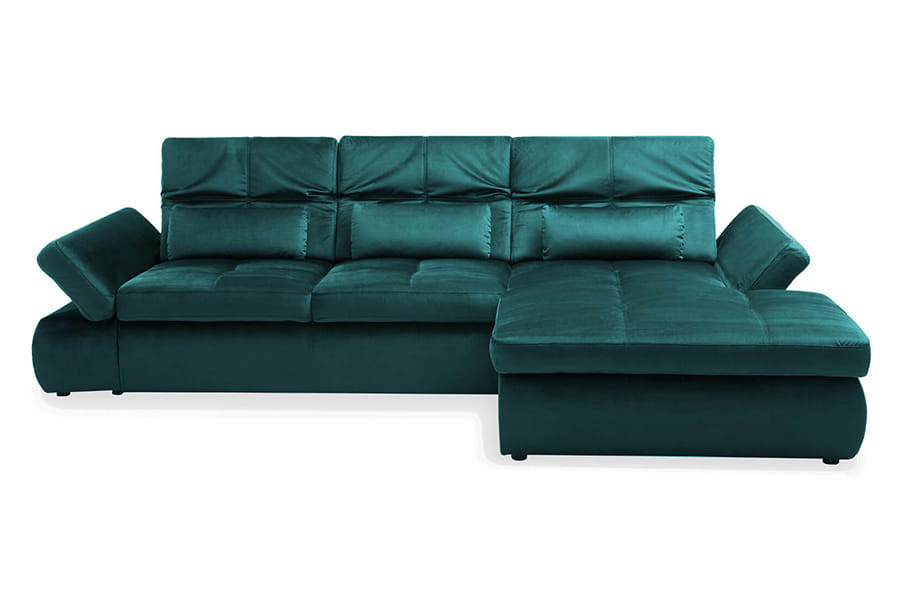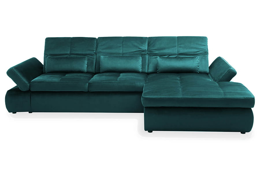 Nowoczesny i funkcjonalny narożnik to propozycja dla wszystkich, którzy poszukują do swojego salonu wypoczynku o wysokiej trwałości i oryginalnym designie. Mebel ten w całości produkowany jest w Polsce ze starannie wyselekcjonowanych materiałów, dlatego też spełnia wszystkie krajowe i europejskiej standardy jakości. Piękny odcień butelkowej zieleni idealnie wpasuję się do Twojego salonu. Narożnik jest wielofunkcyjny, posiada pojemnik na pościel, regulowane zagłówki oraz podłokietniki. W skład zestawu wchodzą poduszki lędźwiowe – 3 szt.