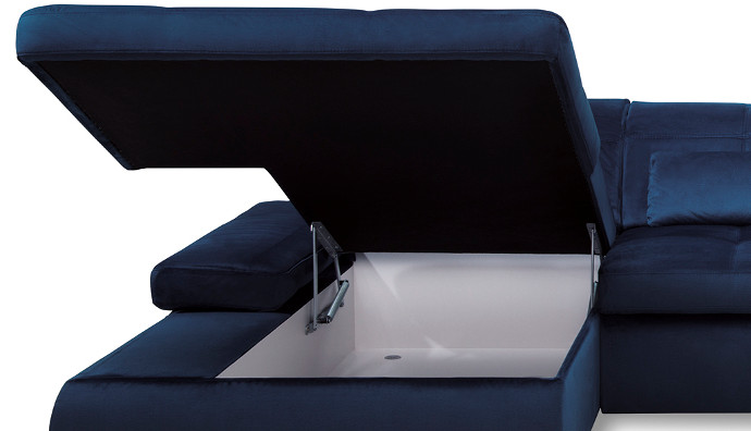 Funkcja spania z ukrytym pojemnikiem na pościel gwarantuje dodatkową korzyść i wygodę (mechanizm rozkładania typu DELFIN). Narożnik został również, wyposażony w dwa wygodne podłokietniki z funkcją regulacji wysokości.