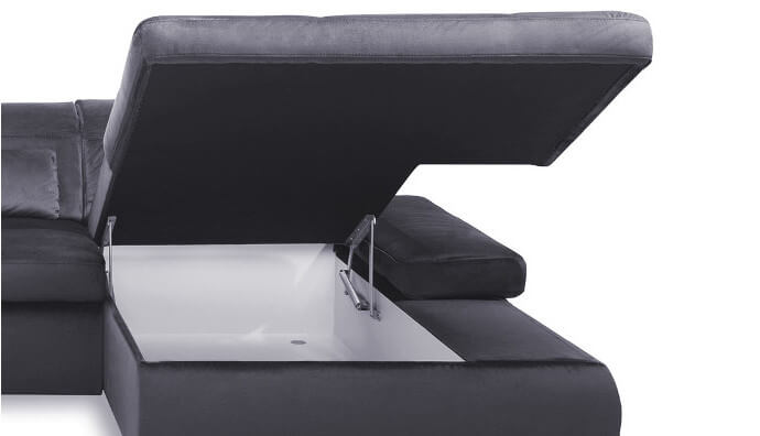 Funkcja spania z ukrytym pojemnikiem na pościel gwarantuje dodatkową korzyść i wygodę (mechanizm rozkładania typu DELFIN). Narożnik został również, wyposażony w dwa wygodne podłokietniki z funkcją regulacji wysokości.