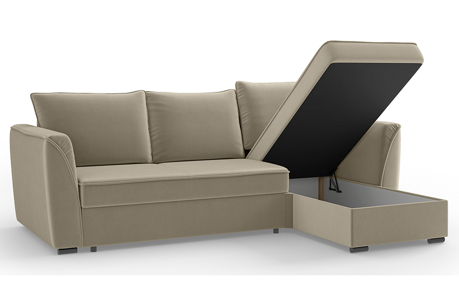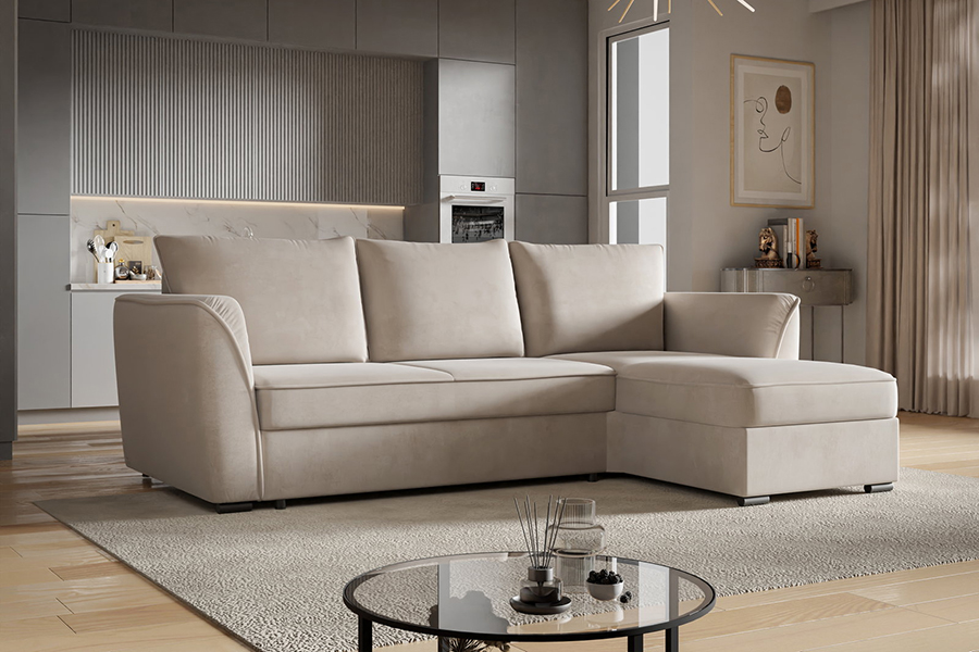 Narożnik Viki został wykonany z myślą o osobach poszukujących dużej powierzchni wypoczynkowej oraz wygodnych rozwiązań codziennego użytku. Funkcji spania typu delfin, rozłożenie narożnika jest szybkie i bezproblemowe, co sprawia, że bez wysiłku zamienisz go w wygodne łóżko dla siebie lub gości. Wbudowany pojemnik na pościel to idealne rozwiązanie, które pomoże Ci zaoszczędzić miejsce i utrzymać porządek – wszystkie koce i poduszki będą zawsze pod ręką, ale dyskretnie ukryte. Siedzisko, wykonane z połączenia pianki poliuretanowej i sprężyn falistych, zapewnia optymalne podparcie dla ciała. Zdejmowane poduchy oparciowe dają Ci możliwość dostosowania przestrzeni do swoich potrzeb – możesz je łatwo zdjąć i uzyskać dodatkową przestrzeń do siedzenia lub leżenia. Tapicerowany tył narożnika pozwala na swobodną aranżację w dowolnym miejscu pomieszczenia, nie ograniczając Cię jedynie do ustawienia przy ścianie. Wybierając narożnik Viki, zyskujesz nie tylko mebel, ale i codzienną wygodę, która spełni Twoje potrzeby zarówno podczas snu, jak i codziennego użytkowania.