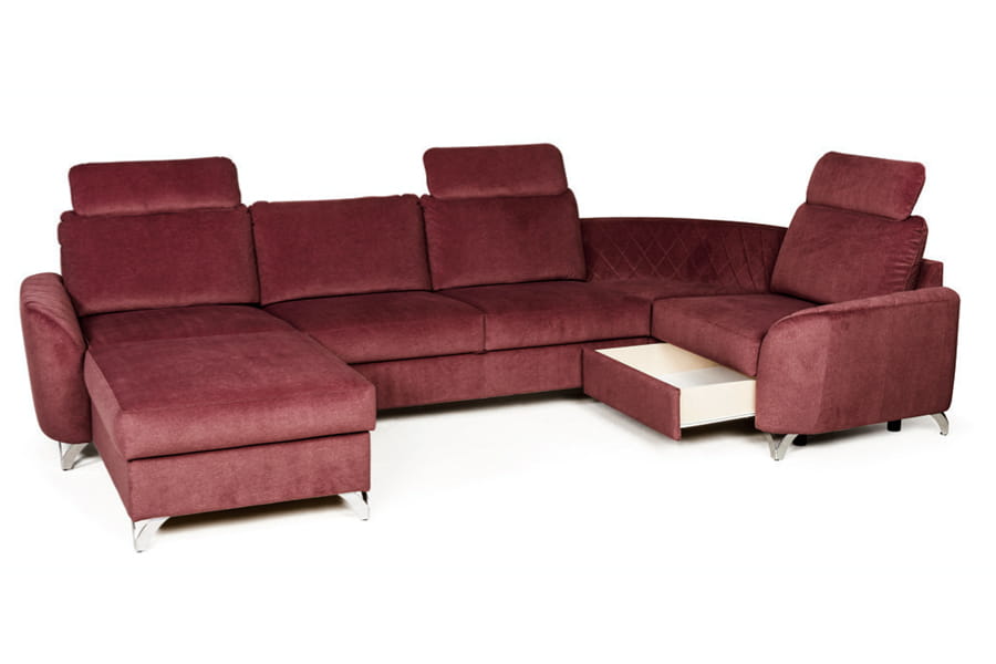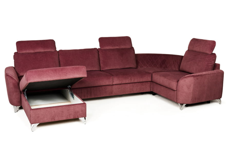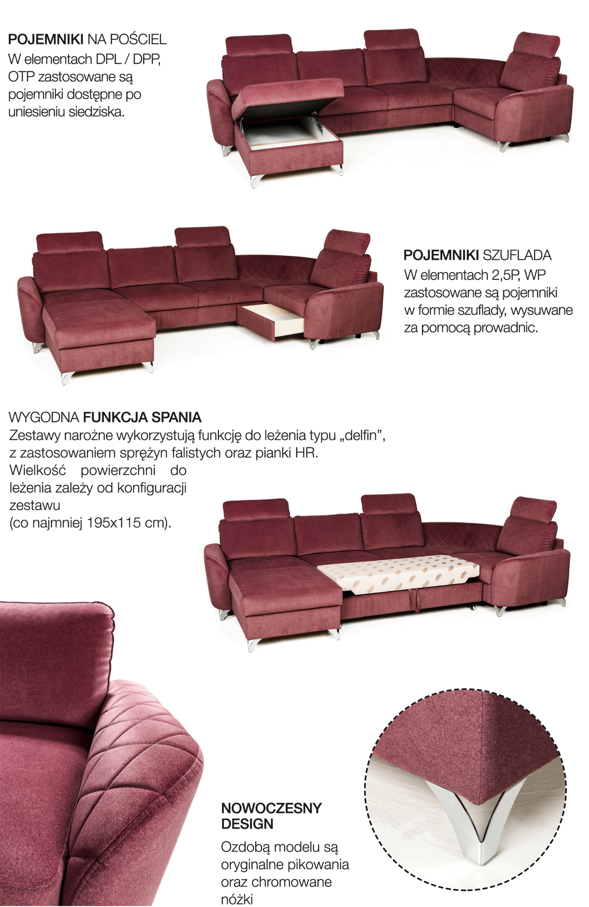 Elegancki narożnik Desio to połączenie wygody i dobrego stylu. Idealna propozycja zarówno do nowoczesnych, jak i klasycznych aranżacji. Narożnik posiada wsuwane zagłówki ( za dopłatą ), co sprawia, że można wygodnie oprzeć głowę podczas wypoczynku. Prosta, minimalistyczna forma stojąca na eleganckich płozach wyposażona została w liczne udogodnienia, które sprzyjają codziennemu wypoczynkowi. Kolejną praktyczną zaletą narożnika jest niezawodny system rozkładania oparty na wózku. W krótszym boku oraz otomanie mebla kryją się natomiast obszerne dwa pojemniki na pościel. Narożnik występuje w wersji prawostronnej oraz lewostronnej.