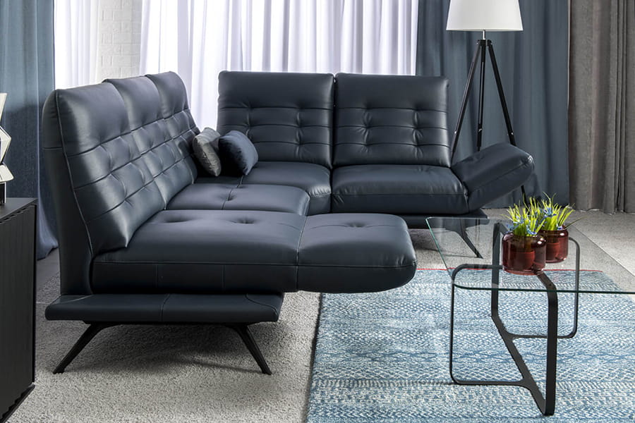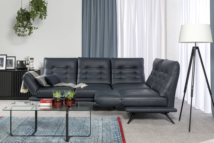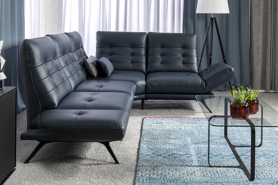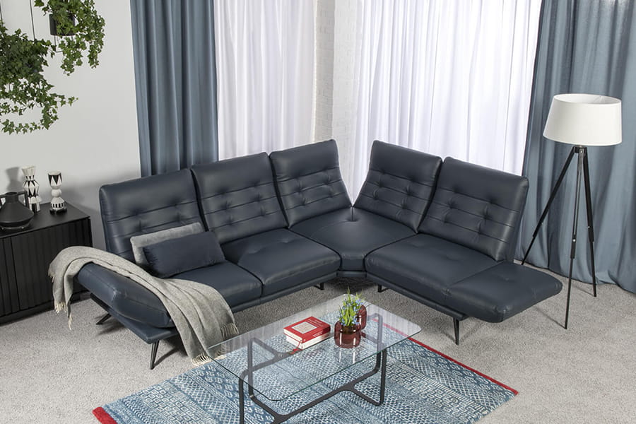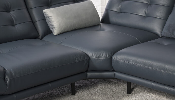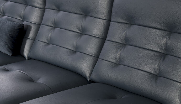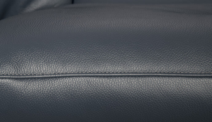 Skóra licowa jest miękka (S2 147 - granat), naturalnie elastyczna i wytrzymała. Zachowuje piękną, wyraźną fakturę i naturalny rysunek. Dlatego wykonuje się z niej siedziska mebli, ich oparcia oraz wszystkie elementy, które podczas użytkowania pracują, rozciągają się.