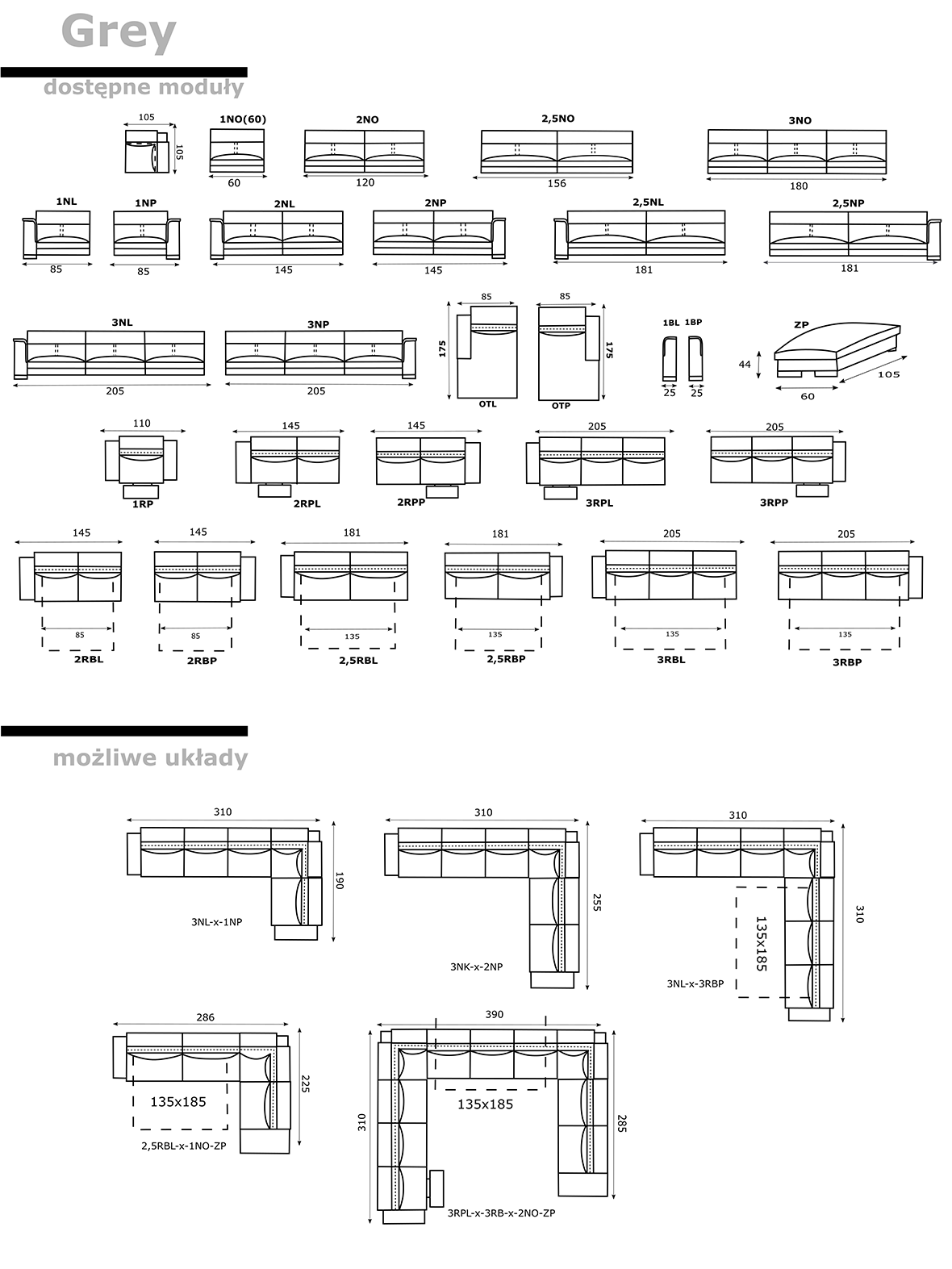 Grey to zestaw nowoczesnych mebli wypoczynkowych składający się z fotela, sofy 2 i sofy 3. Wszystkie elementy mogą posiadać dodatkową funkcjonalność w postaci funkcji relaks sterowanej sensorowo. Meble dostępne są w tapicerowaniu skórą naturalną oraz w tkaninach. Istnieje możliwość modyfikacji wymiarów poszczególnych elementów. W standardzie jest także możliwość przeszycia kontrastowymi nićmi.