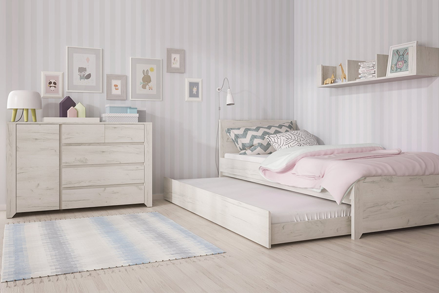 Nie wiesz, jak zaaranżować pokój dziecka? Ciągle zmieniasz koncepcję, szukając mebli w uniwersalnym, neutralnym kolorze, który pasuje do każdej stylizacji? Kolekcja Angel jest stworzona właśnie dla Ciebie. Dzięki eleganckiemu dekorowi Dębu White Craft, inspirowanemu bielonym drewnem, seria ta doskonale wkomponuje się w każde wnętrze, niezależnie od wieku dziecka. W ofercie znajdziesz nawet łóżeczko niemowlęce z regulacją wysokości materaca. Marzysz o stworzeniu przytulnej atmosfery? Postaw na delikatne kolory i subtelne wzory. Jeśli unikasz białych ścian, wybierz pastelowe barwy! Jasne odcienie błękitu, różu czy zieleni podkreślą dziecięcy klimat i sprawią, że pokój stanie się spokojnym miejscem do nauki i zabawy.