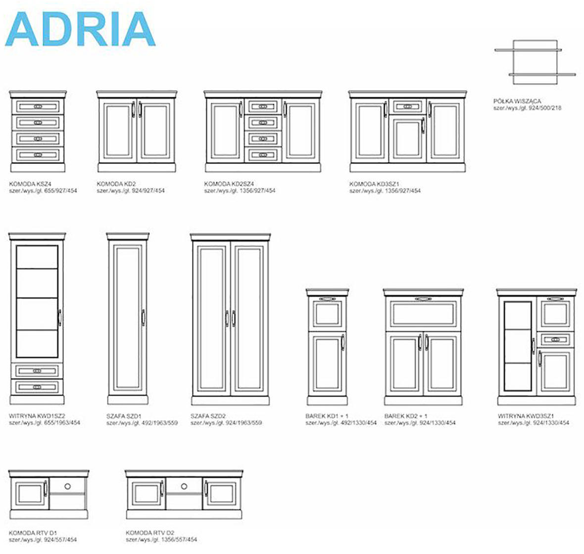 Kolekcja ADRIA została stworzona z myślą o stworzeniu unikatowego, a jednocześnie eleganckiego pokoju dziennego. Cechą charakterystyczną kolekcji są frezy na froncie mebli oraz metalowe uchwyty. Do produkcji wykorzystano wysokiej jakości płyty meblowe laminowane oraz płyty MDF, metalowe uchwyty oraz szkło hartowane. Adri składa się z mebli takich jak: komoda dwudrzwiowa, komoda trzydrzwiowa z szufladą lub bez, półka ścienna, jednodrzwiowy regał, szafa, witryna jednodrzwiowa lub dwudrzwiowa, szafka RTV oraz opcjonalne wyposażenie szafy.