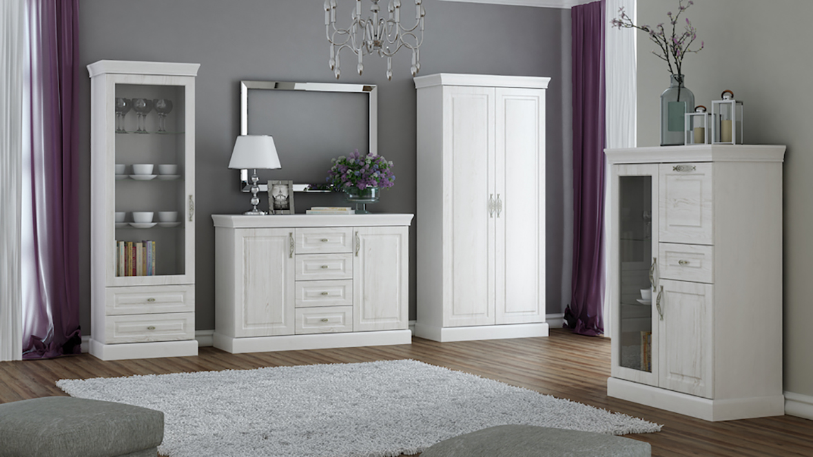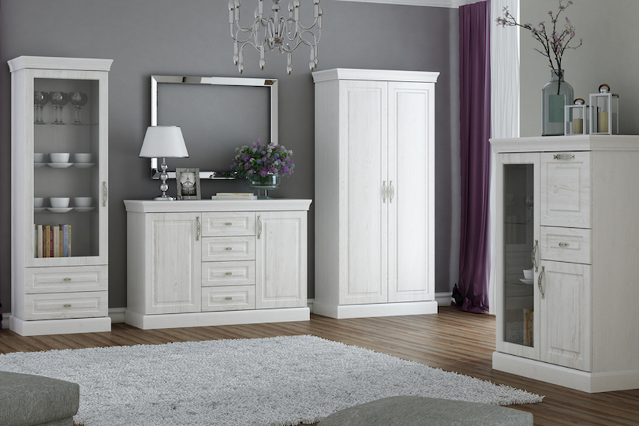 - Klasyczny styl mebli podkreślają ozdobne korony oraz metalowe stylizowane uchwyty.