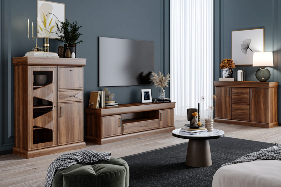 Kolekcja Adria producenta Tłok Meble to klasyczna aranżacja pokoju dziennego oraz salonu. Kolekcja dostępna jest w dwóch wersjach kolorystycznych do wyboru. Cechą charakterystyczną kolekcji są frezy na froncie mebli oraz metalowe uchwyty. Do produkcji wykorzystano wysokiej jakości płyty meblowe laminowane oraz płyty MDF.