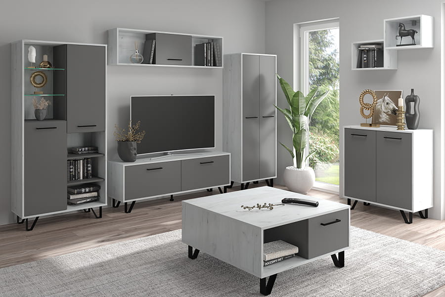 Meble BOSS to kolekcja o nowoczesnej linii. Do produkcji mebli wykorzystano najwyższej jakości płyty laminowane oraz akcesoria, dzięki czemu meble są trwałe i solidne. Na uwagę zasługują wysokie, metalowe nóżki w kolorze czarnym. Kolekcja jest dostępna w kilku wersjach kolorystycznych do wyboru. Świetnie sprawdzi się w salonie, pokoju dziennym, przedpokoju, sypialni i innych pomieszczeniach mieszkalnych.